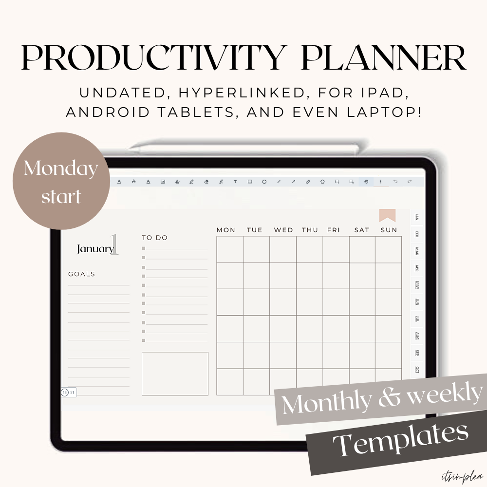 Digital undated Planner, Minimal Hyperlinked yearly, monthly and Weekly Planner.