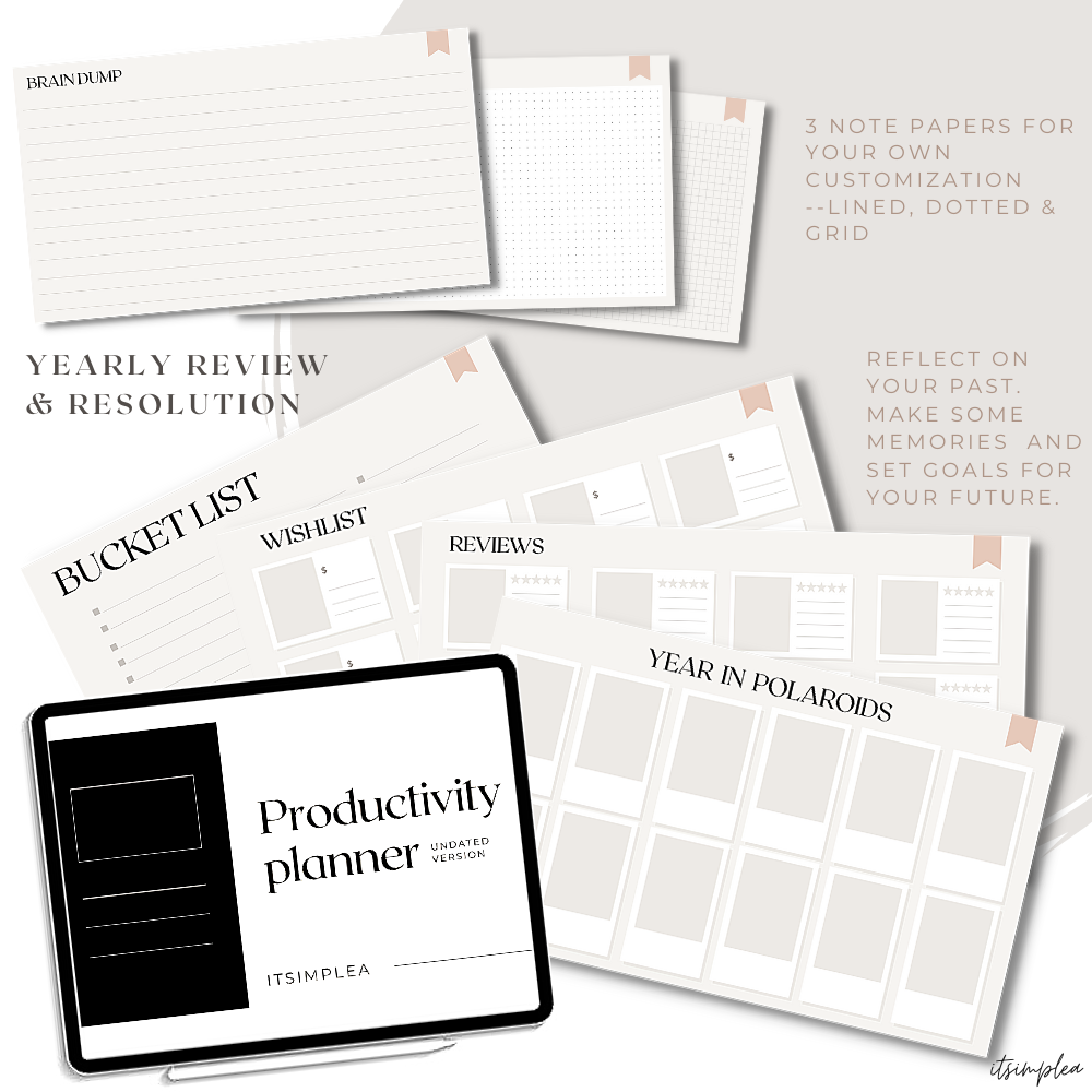 This digital planner offers you an effective system to track your year/ weeks and days, it has a very minimalist design, simple and user-friendly to keep you motivated to set goals and get things done in your everyday life!