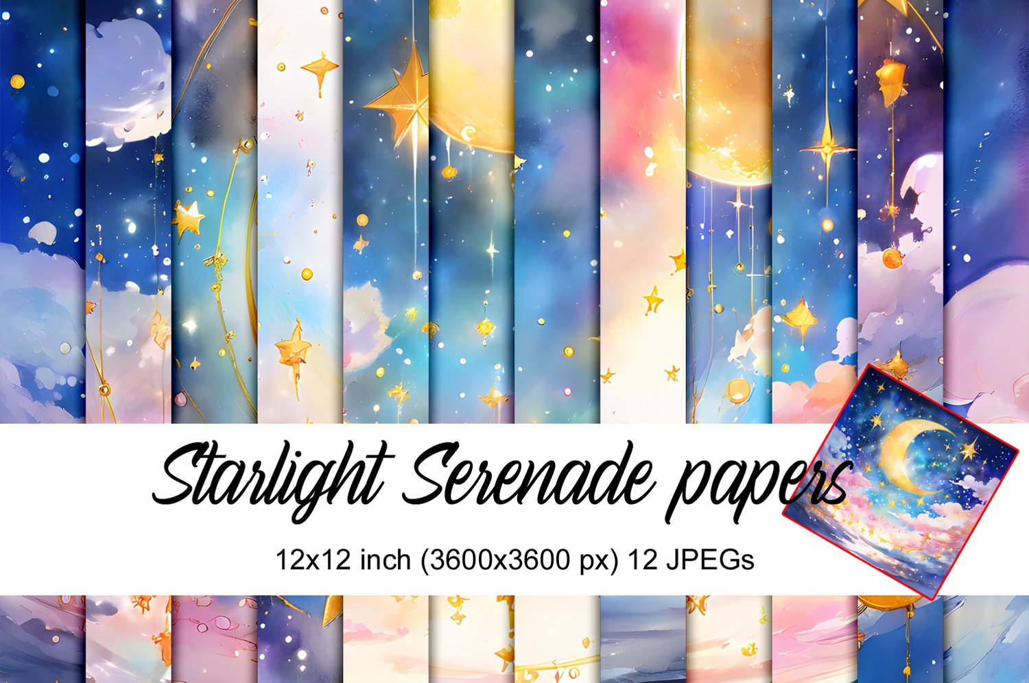 Keywords: starlight serenade digital papers, celestial scrapbook paper pack, moon and stars digital papers, night sky digital backgrounds, gold celestial texture papers, mystical galaxy scrapbook papers, starry night digital papers, blue and gold celestial designs, cosmic galaxy background papers, astrology themed craft papers, moonlight digital backgrounds, celestial watercolor scrapbook papers, starry sky digital papers