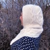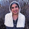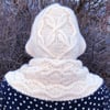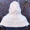 When I saw the yarn for this sample, I immediately said that it looked just like a cloud. Imagine my surprise when I found out that the yarn name was the Quechua word for cloud! Later, I found that even the color name was cloud. Undulating cables are utilized to represent all kinds of clouds in this warm, hooded scarf, named in Arabic for clouds.
