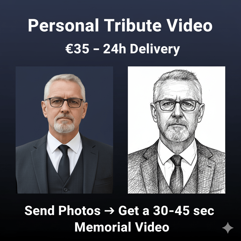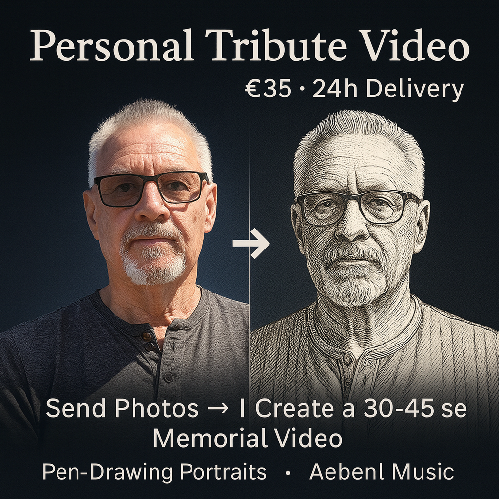 I create a custom 30–45 second tribute video based on your photos, transformed into artistic AI pen-drawing portraits with soft emotional music from my Aebenl catalog.