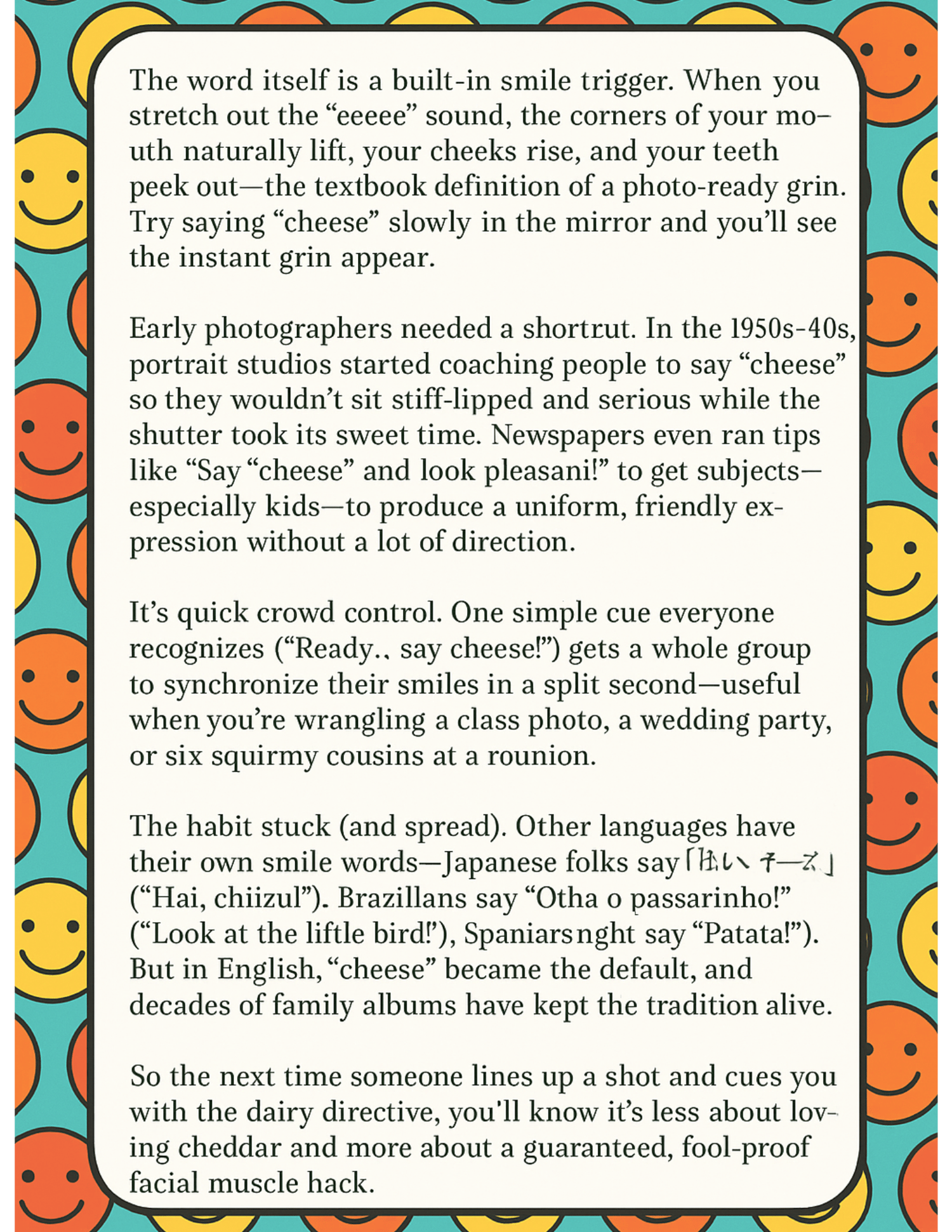 ✔ Understand the origin and purpose of the phrase “say cheese”