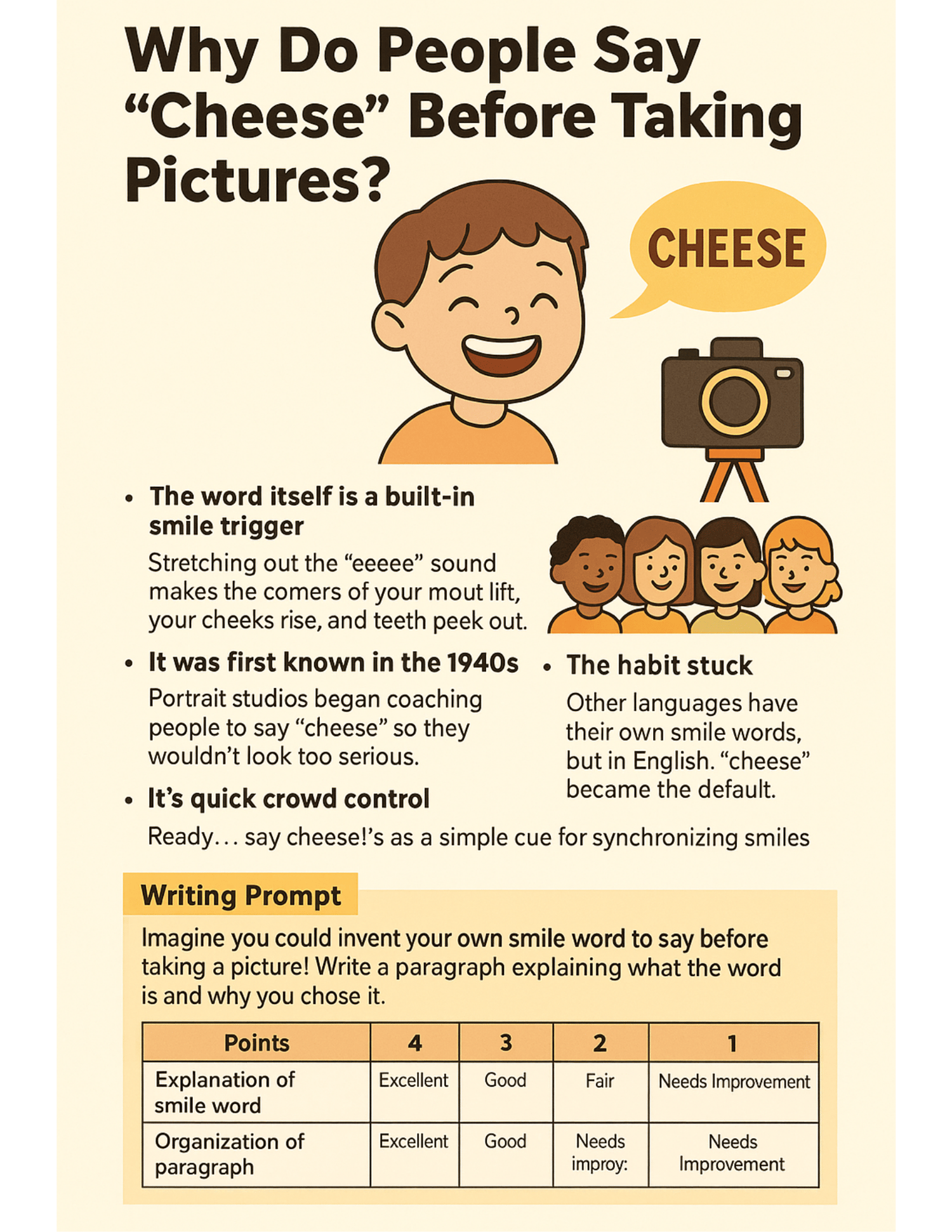 Why Do We Say “Cheese”? | Printable Reading & Writing Activity (Grades 2–4)