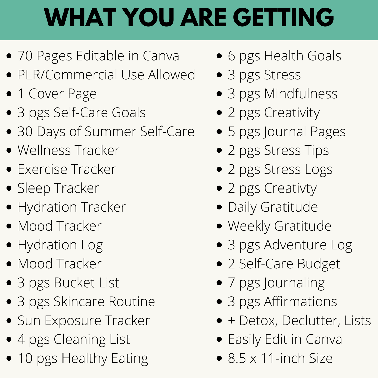 The Summery Self-Care Planner PLR is a beautiful template that you can easily edit in Canva and make your own to sell it to your audience. They won't be able to resist with all the value packed inside the 70 pages.