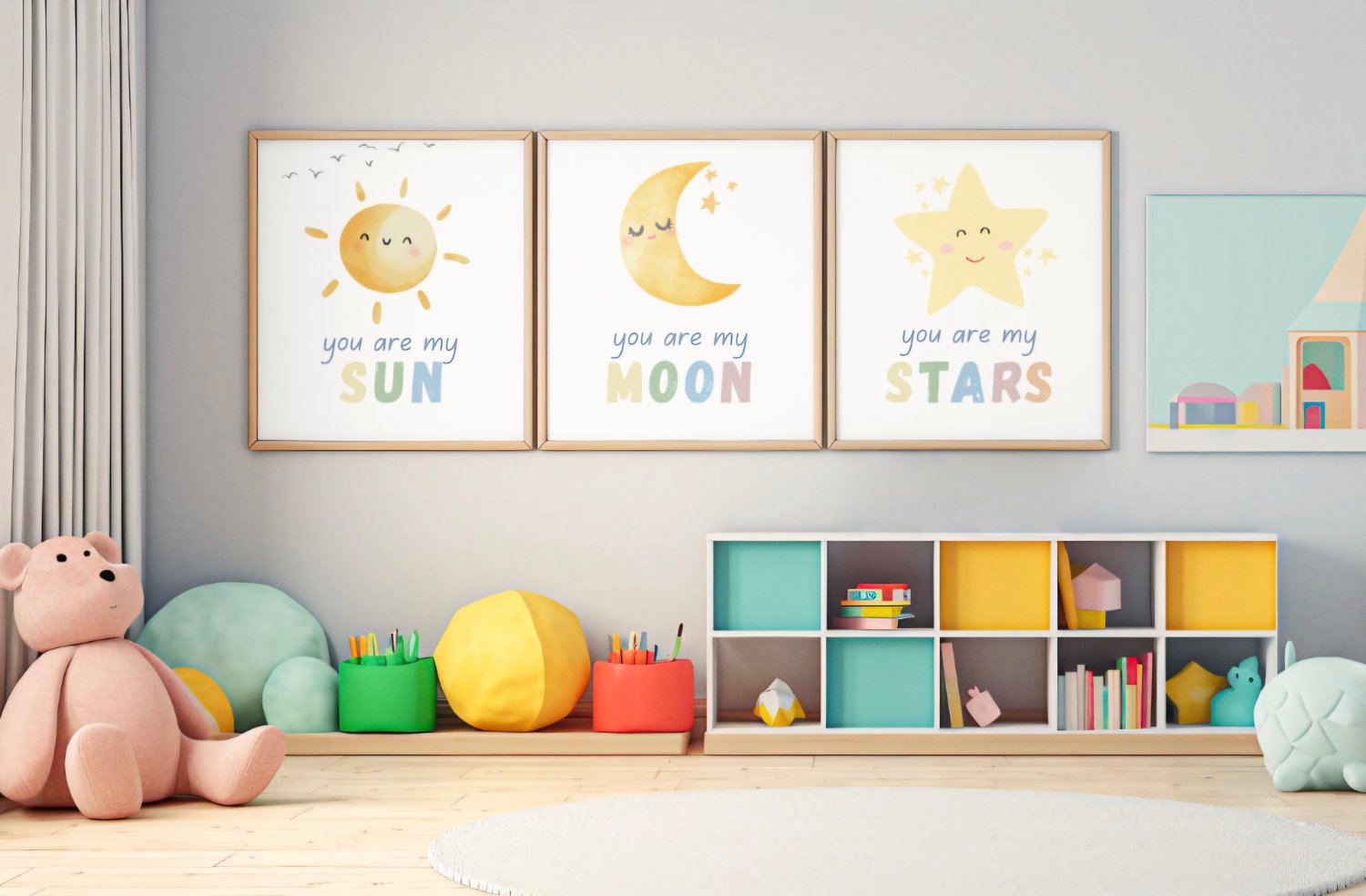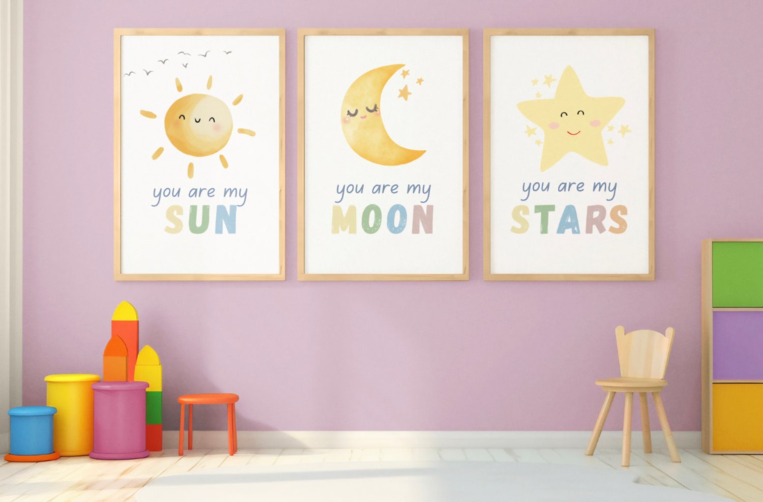 Brighten your child's bedroom or baby nursery with our delightful You Are My Sun, Moon and Stars 3 Piece Poster Set.