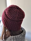 PORTCULLIS is a watch cap knit in a fascinating faux-woven texture with an extra-deep brim and a full lining for greater wind protection. The sizing in this pattern is more about style than fit; all sizes should fit a range of head sizes but each size gets progressively grander in scale, beginning with the sleek outline of the small and culminating with the over-sized