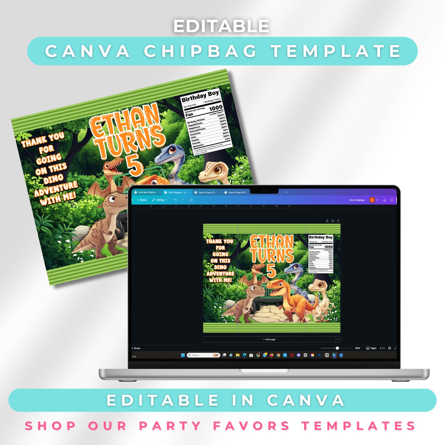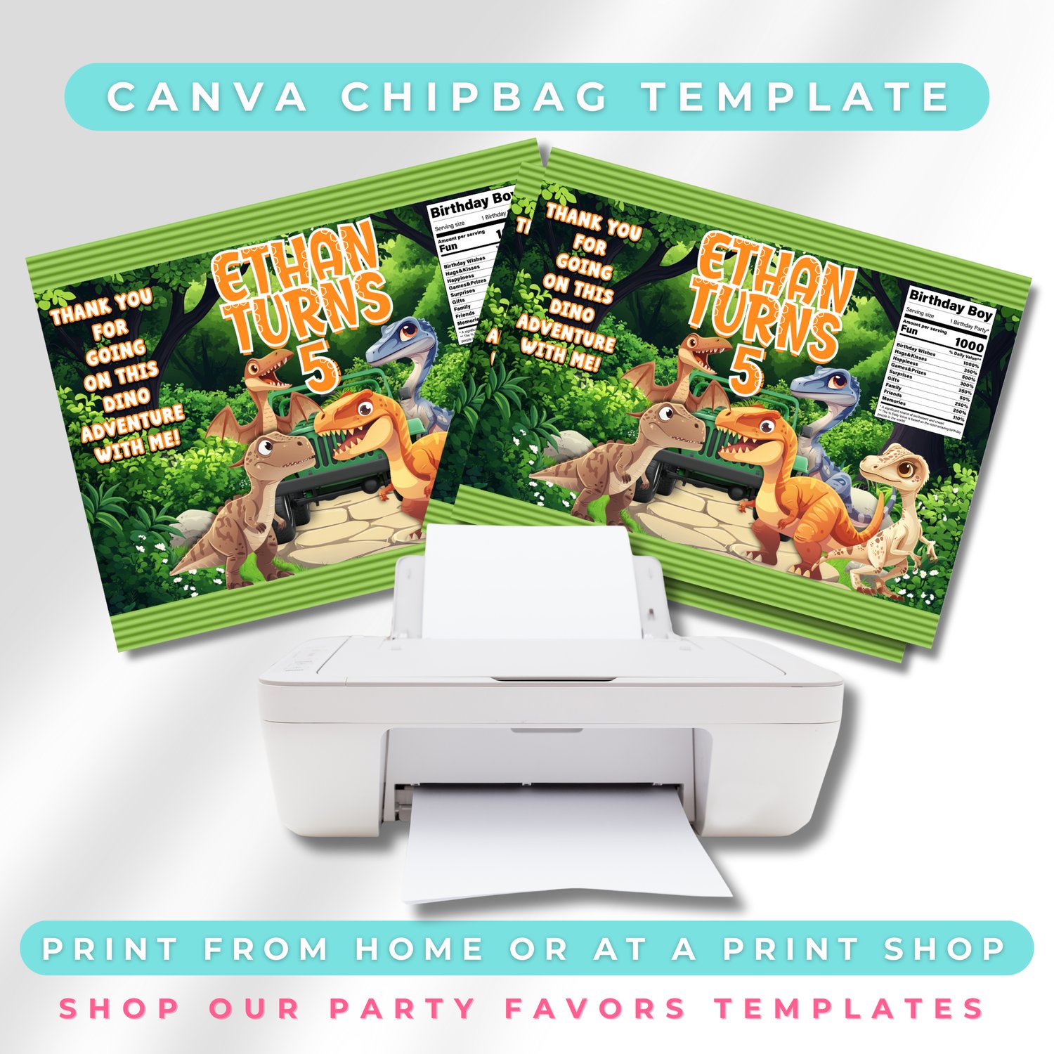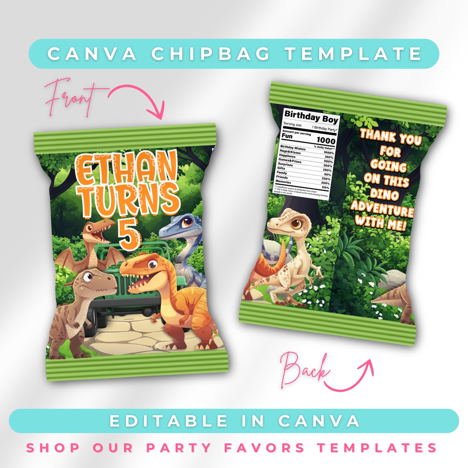 Dino Adventure Chip Bag Template – Editable in Canva | Dinosaur Birthday Party Favor | Digital Download