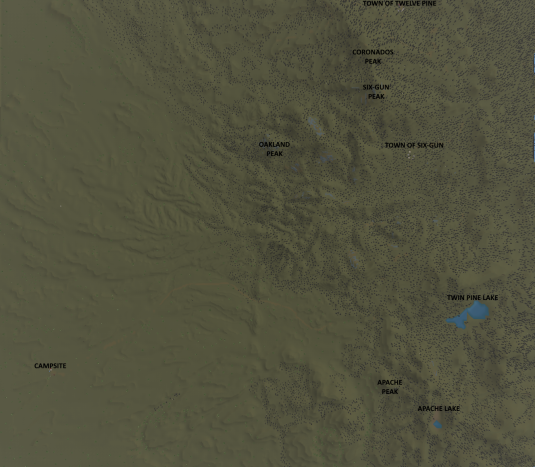 This map has windy dirt mountain roads, two small mine towns, two medium ponds, and many rocky terrain features.