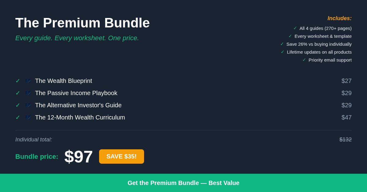 The Premium Bundle includes every guide in the Capital Curriculum library — over 270 pages of investing education, 25+ worksheets and calculators, and a complete 12-month action plan.