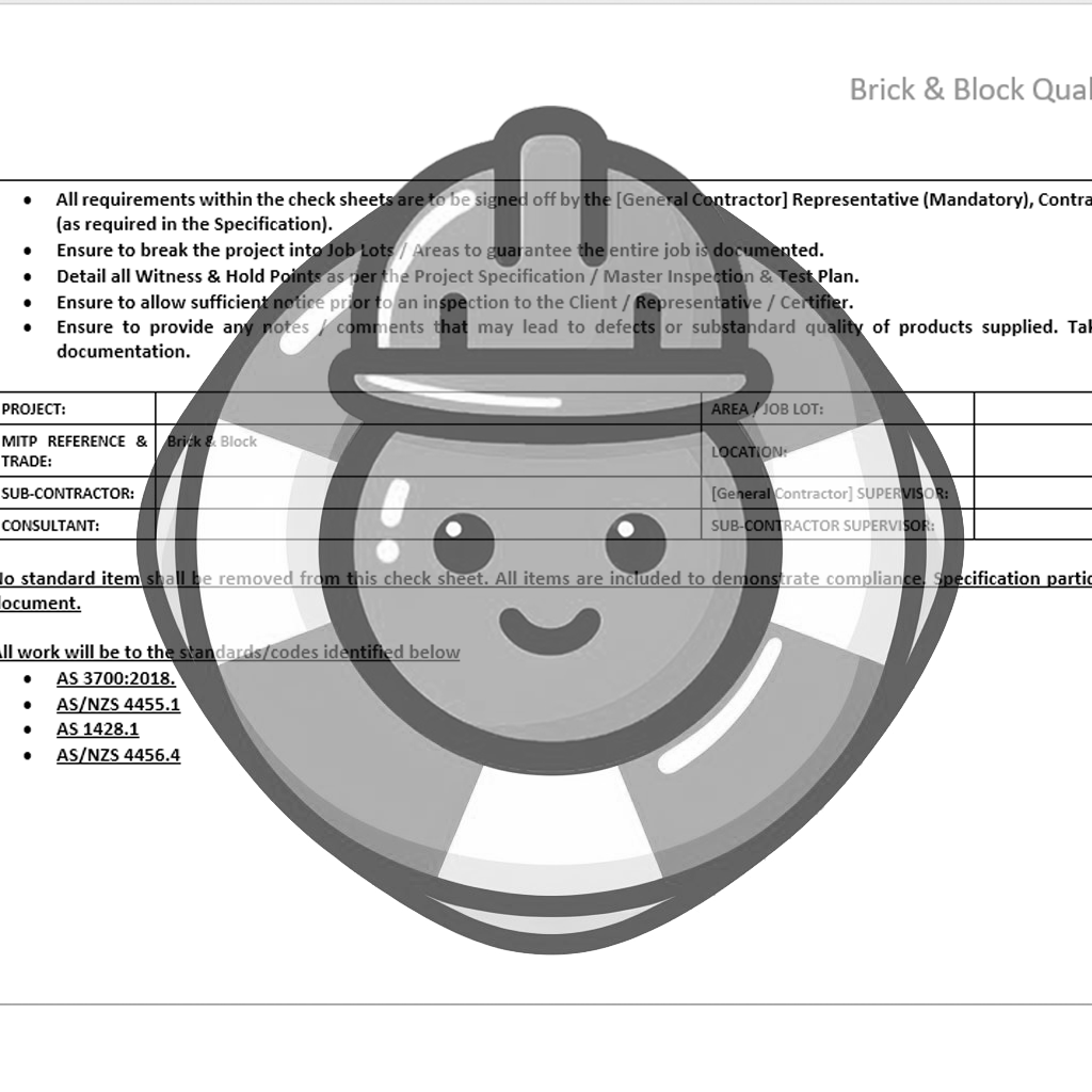 Inspection Test Plan for the installation of Bricks and Blocks, includes options for the provisions of samples and the installation of AAC Panels (Hebel) within projects.