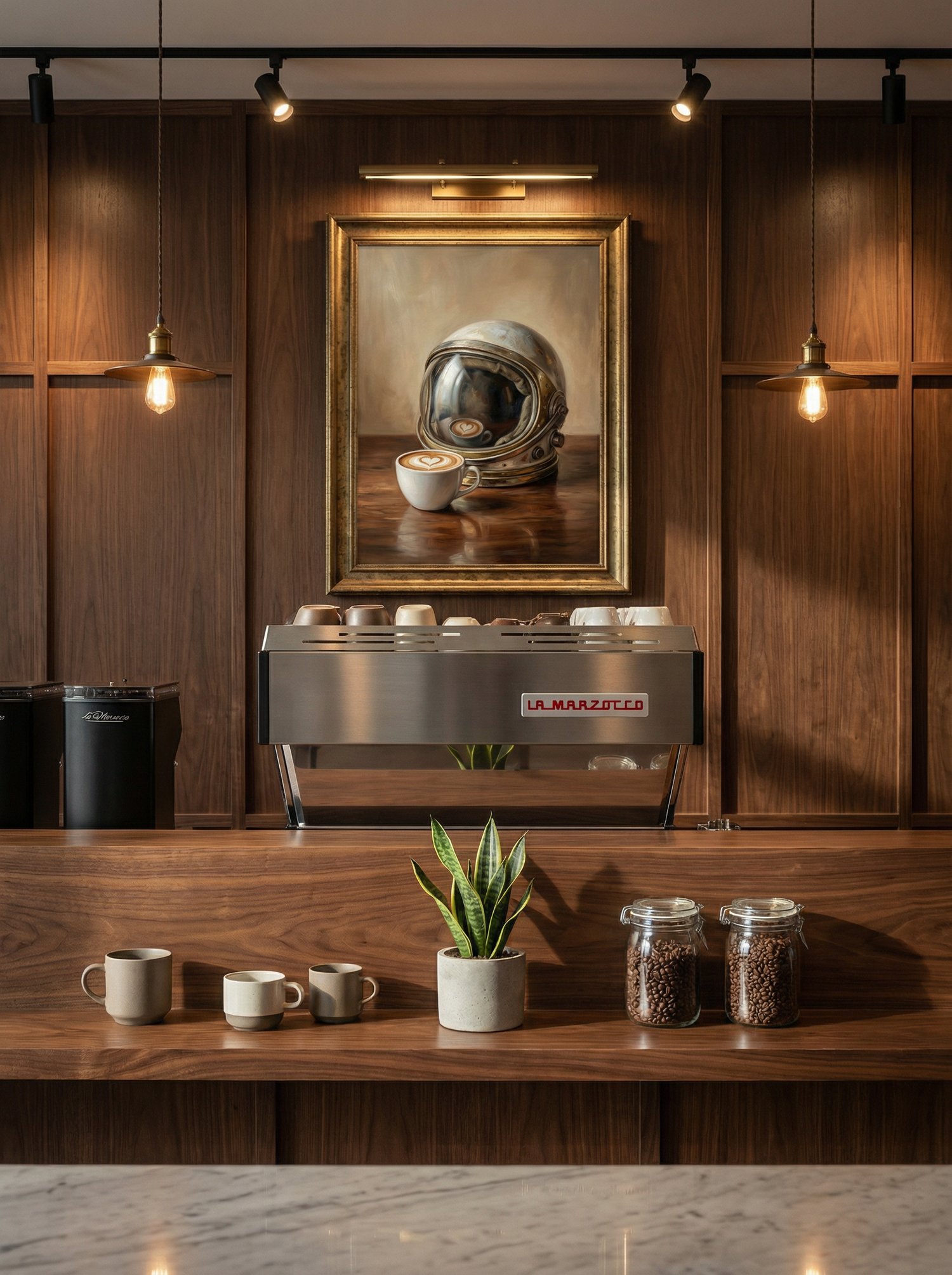 A surreal oil painting where space exploration meets café ritual.