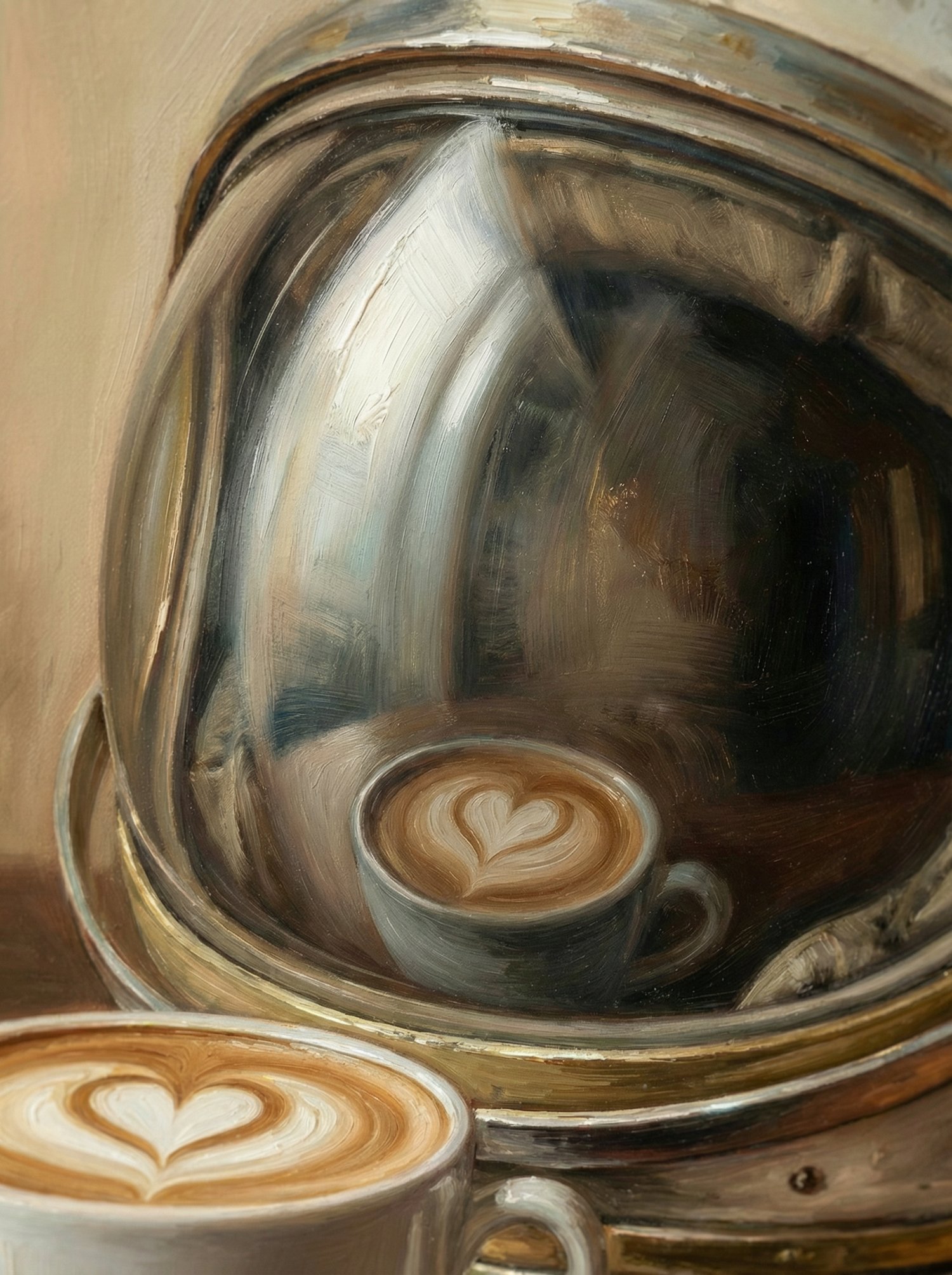 An antique astronaut helmet rests on a wooden table beside a freshly poured latte — the heart-shaped foam reflected softly in the visor.