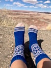 These color-work socks are made using two contrasting colors. It features Vayu from Serendipitous Wool Co. but can be made with any fingering weight yarn.