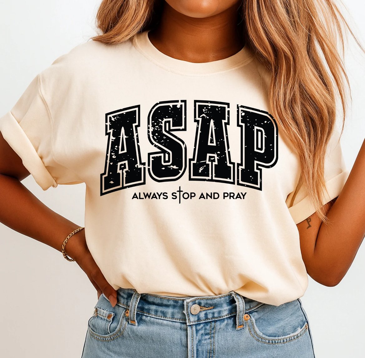 Bring faith and style together with this bold ASAP (Always Stop And Pray) design. Featuring large distressed varsity-style letters and a subtle cross detail, this print is a perfect reminder to pause and pray no matter what life brings.