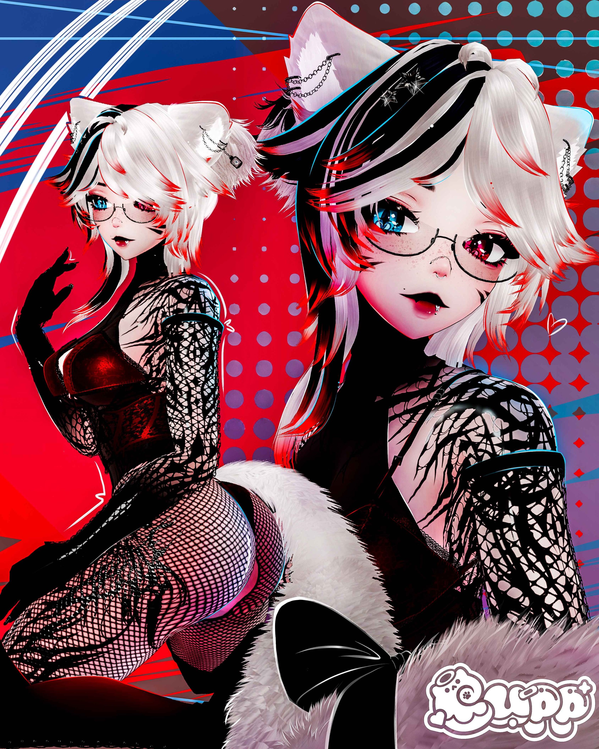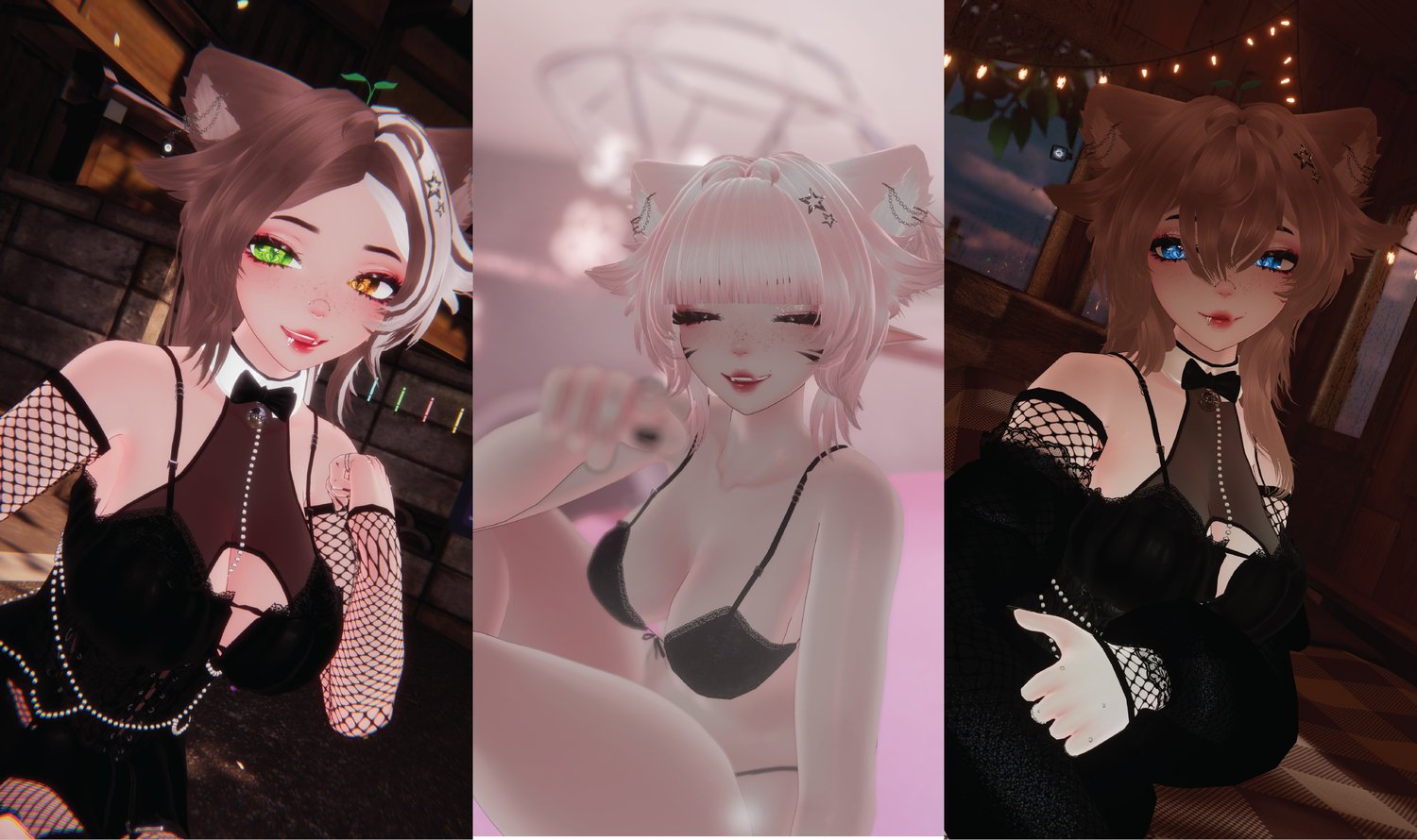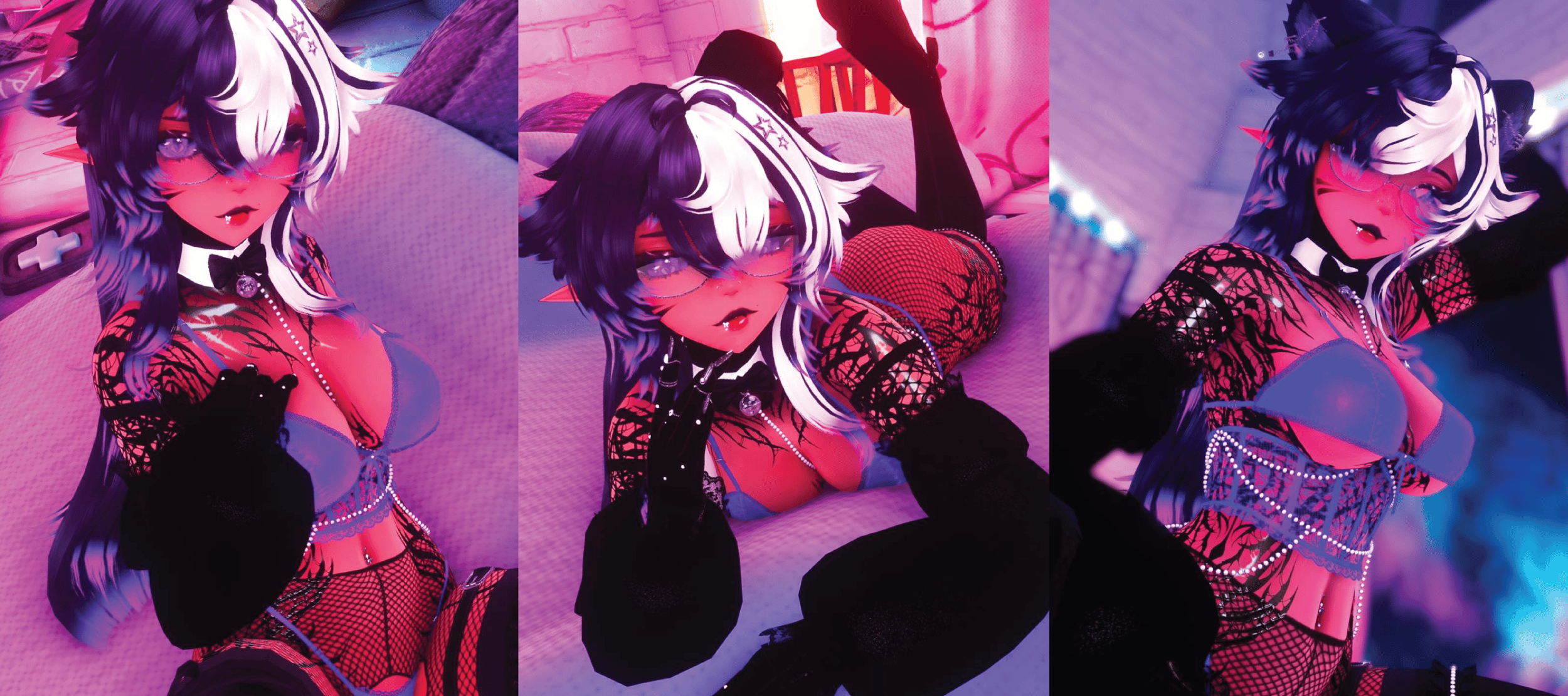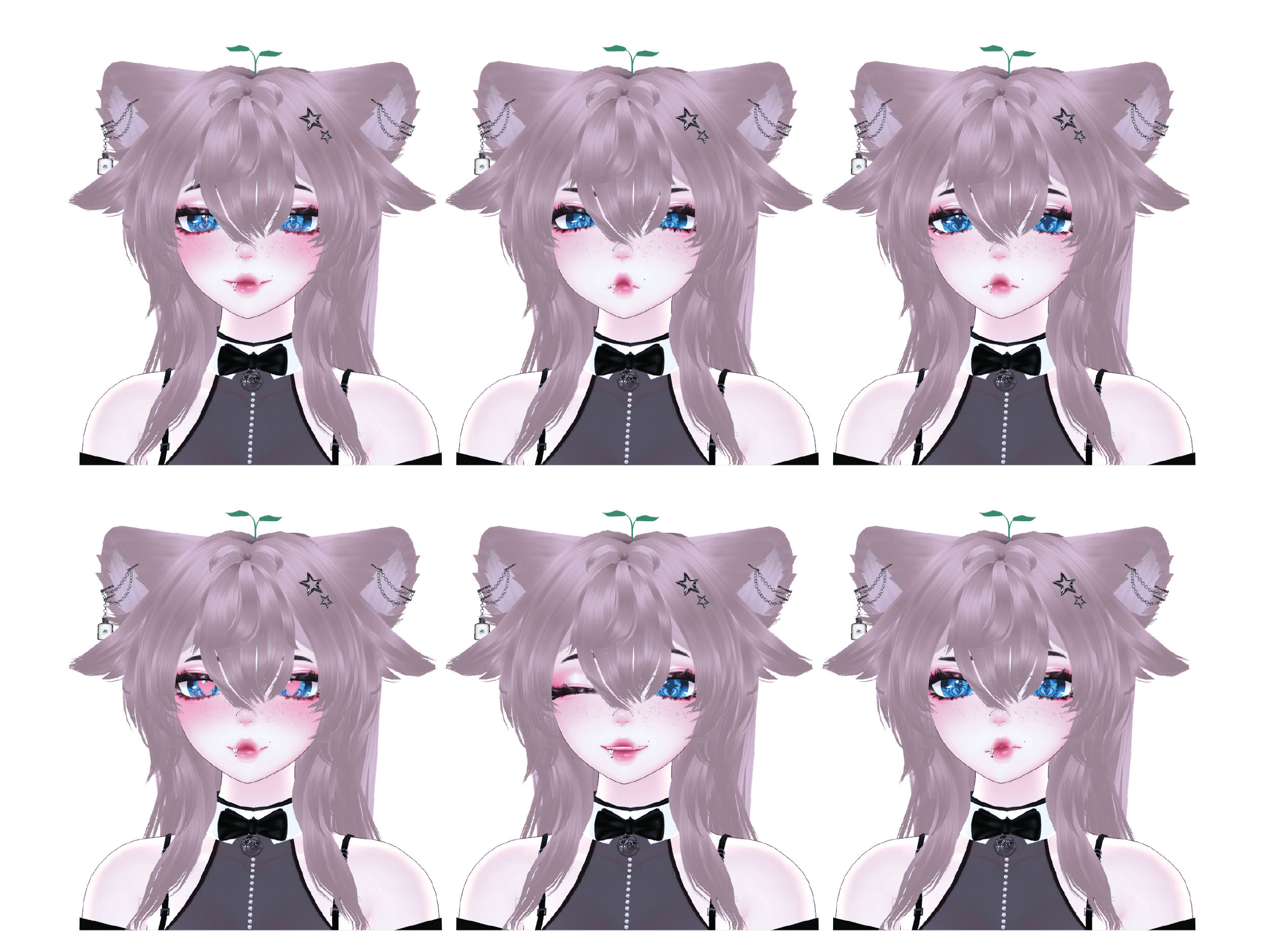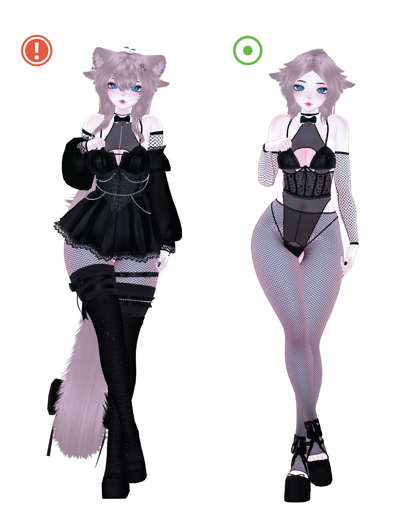 Ears and tail | Hairs and bangs | All piercings | Dress | Corset | Underwear | Pearls | Bow | Rings | Heels and Boots | Harnesses | Glasses | Hair Pin | Fishnet arms | Sleeves | Bodysuit | Leafsprout |