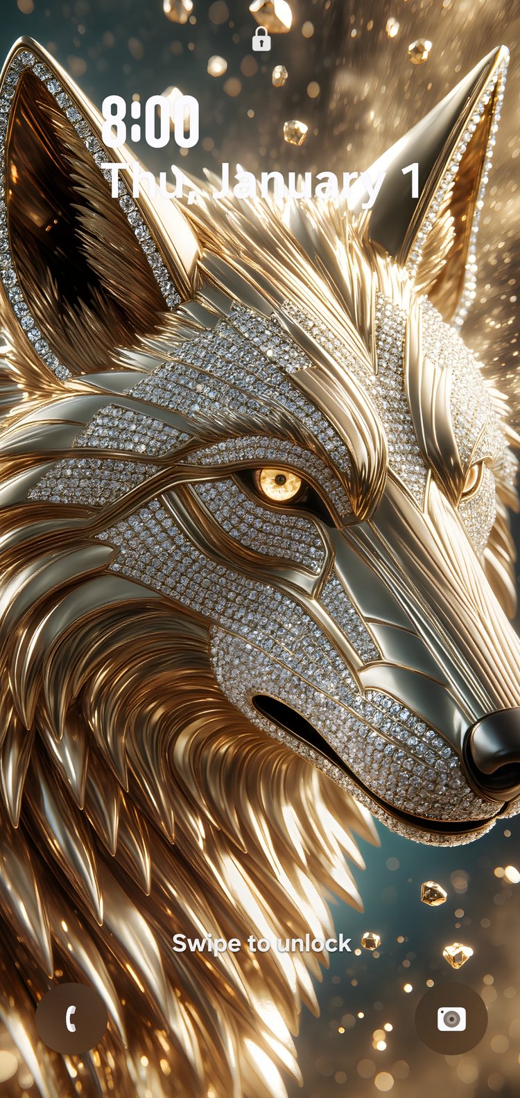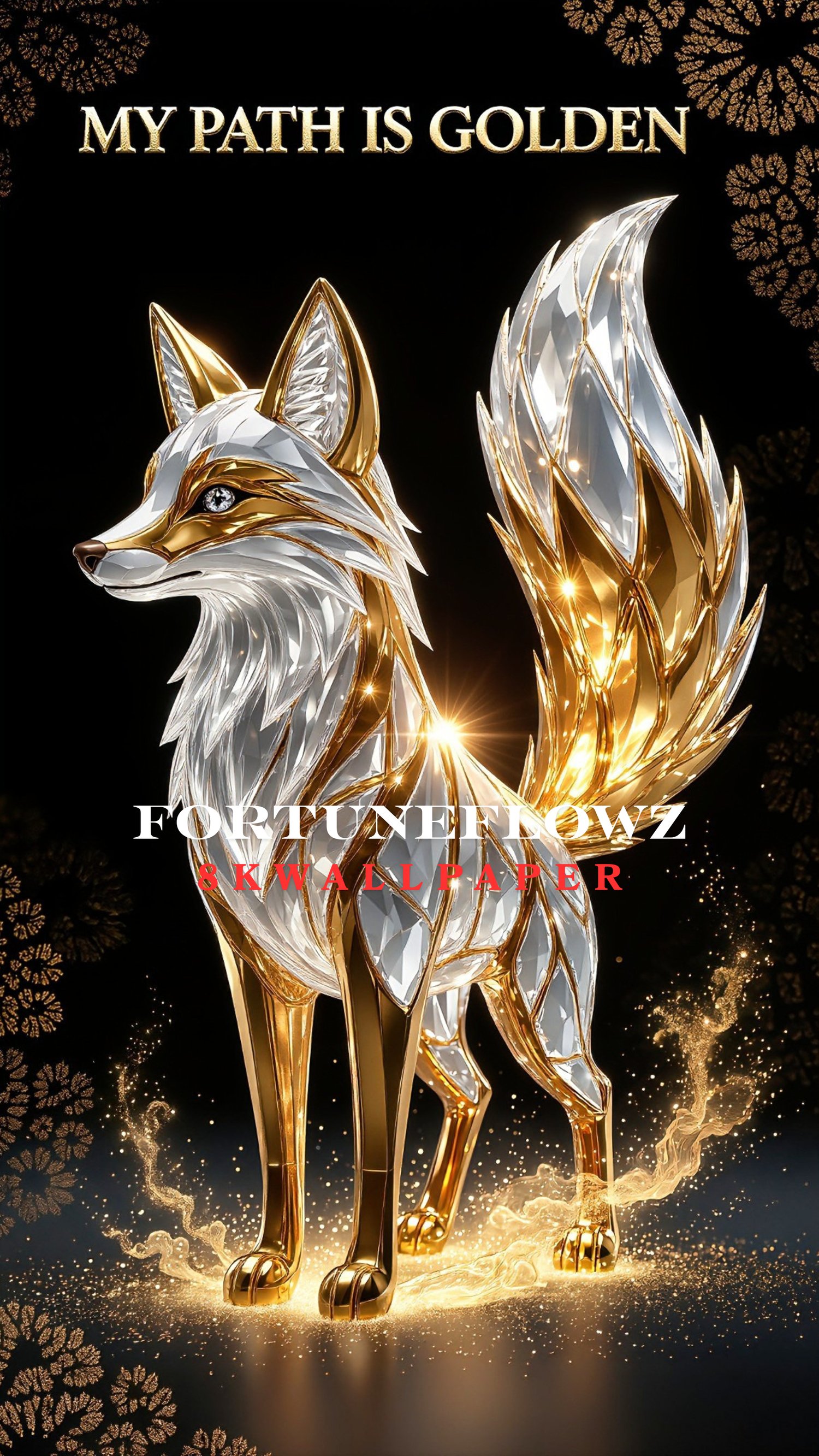 This premium 8K phone wallpaper features a sculpted golden fox rendered in a high-detail, luxury art style. Designed with crystal-like textures, reflective gold accents, and a dramatic dark backdrop, the composition emphasizes elegance, balance, and visual depth.
