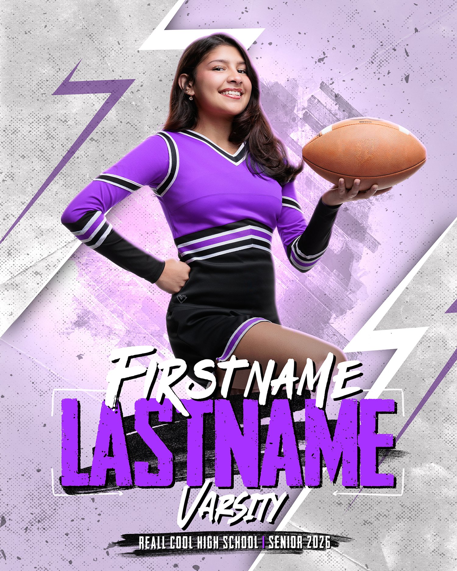 Bring energy to your athlete portraits with the CHARGED template. Designed with bold lighting, textured detail, and a high-impact layout, this template delivers a cinematic, poster-style look that feels powerful and alive. The lightning-inspired design and sharp color contrast make every athlete stand out like the hero of their own highlight reel.