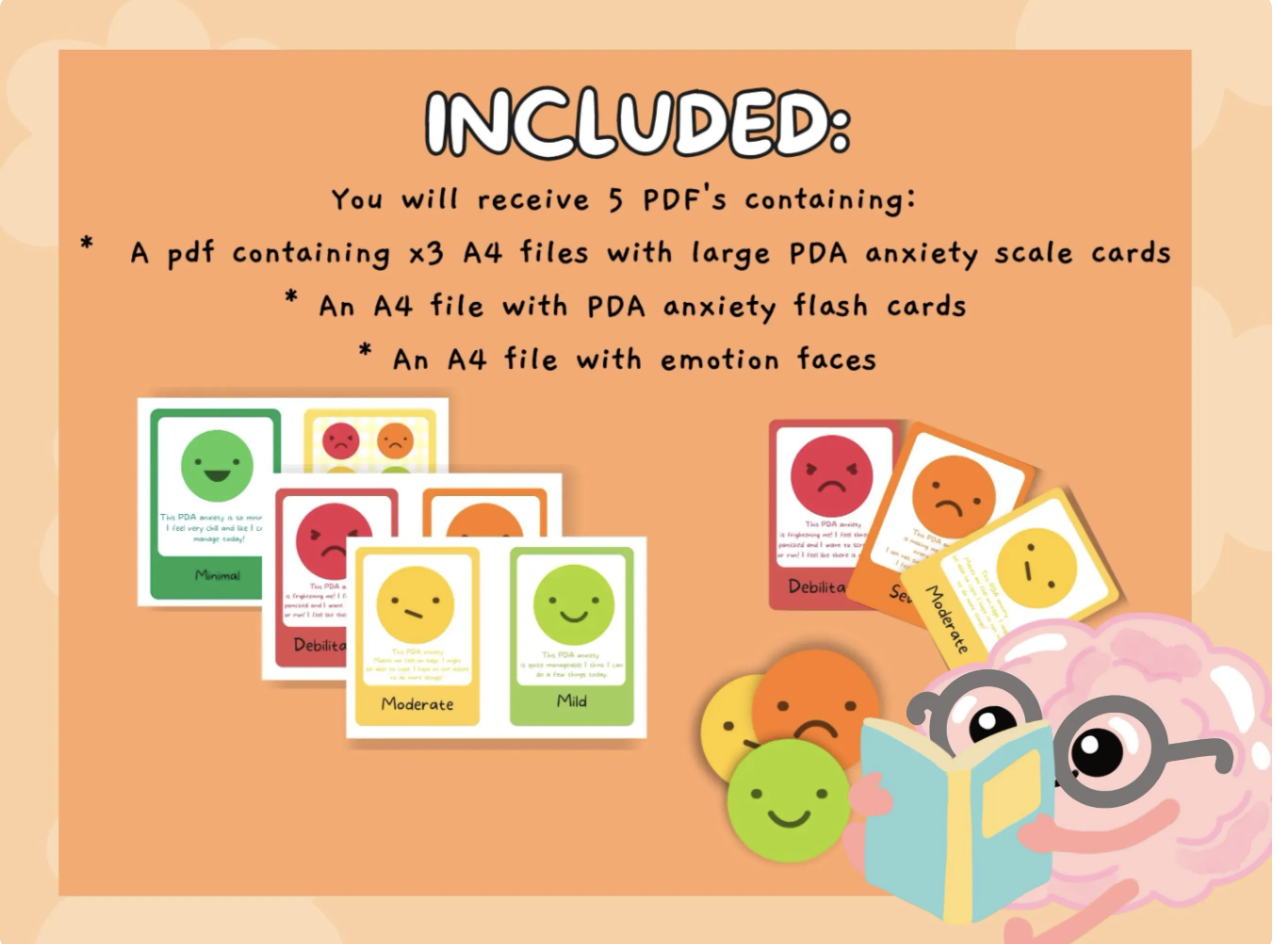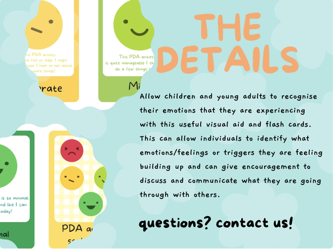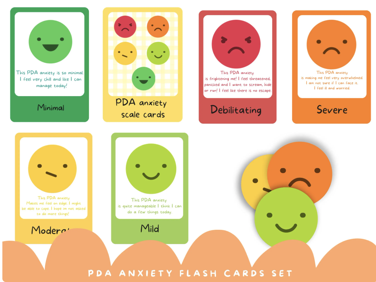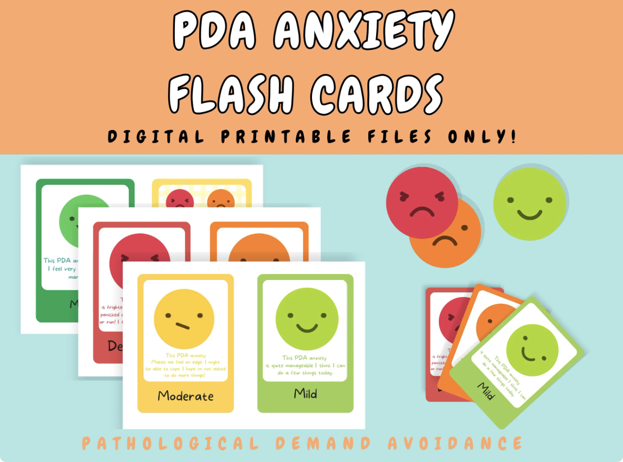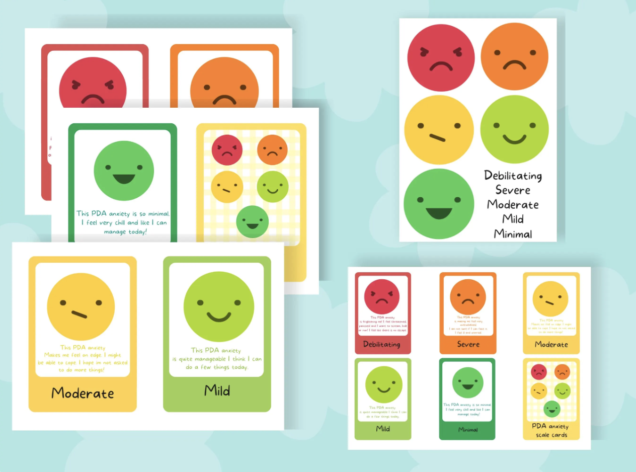 The PDA anxiety scale flash cards has been made for young PDA individuals to recognise their anxiety levels and emotions to use as a regulatory tool or a communication aid. This has been co-designed by a young PDA teen and her mum.