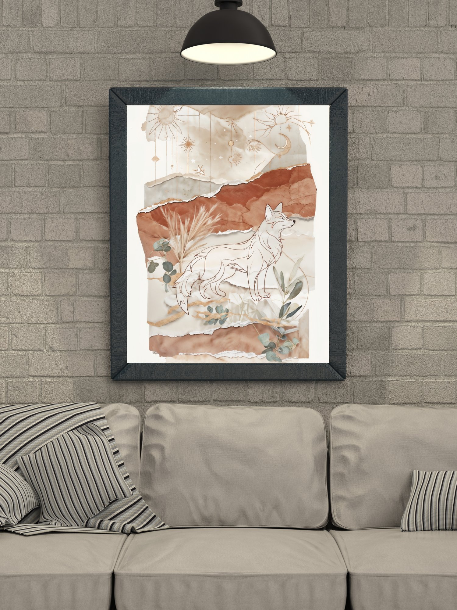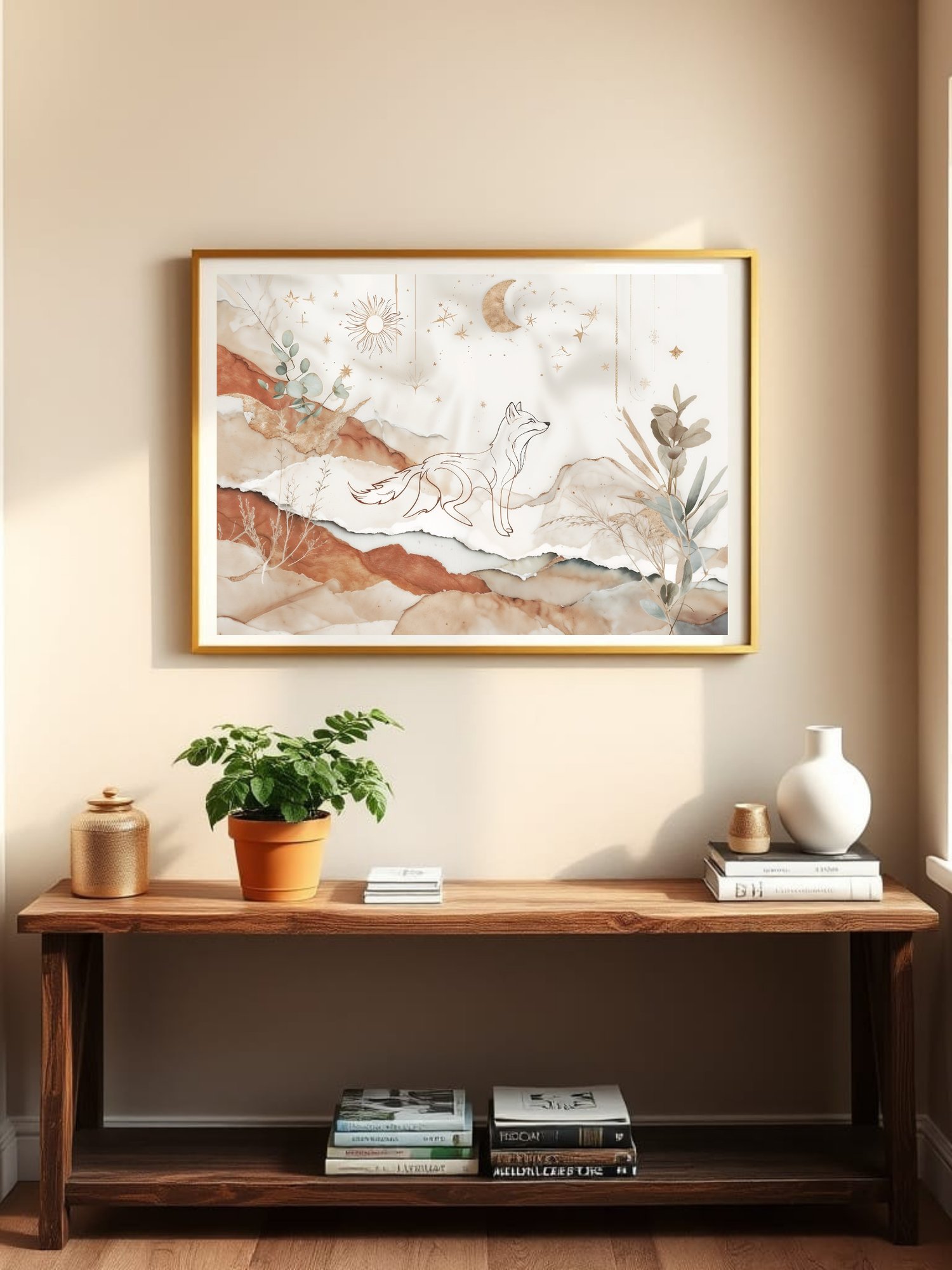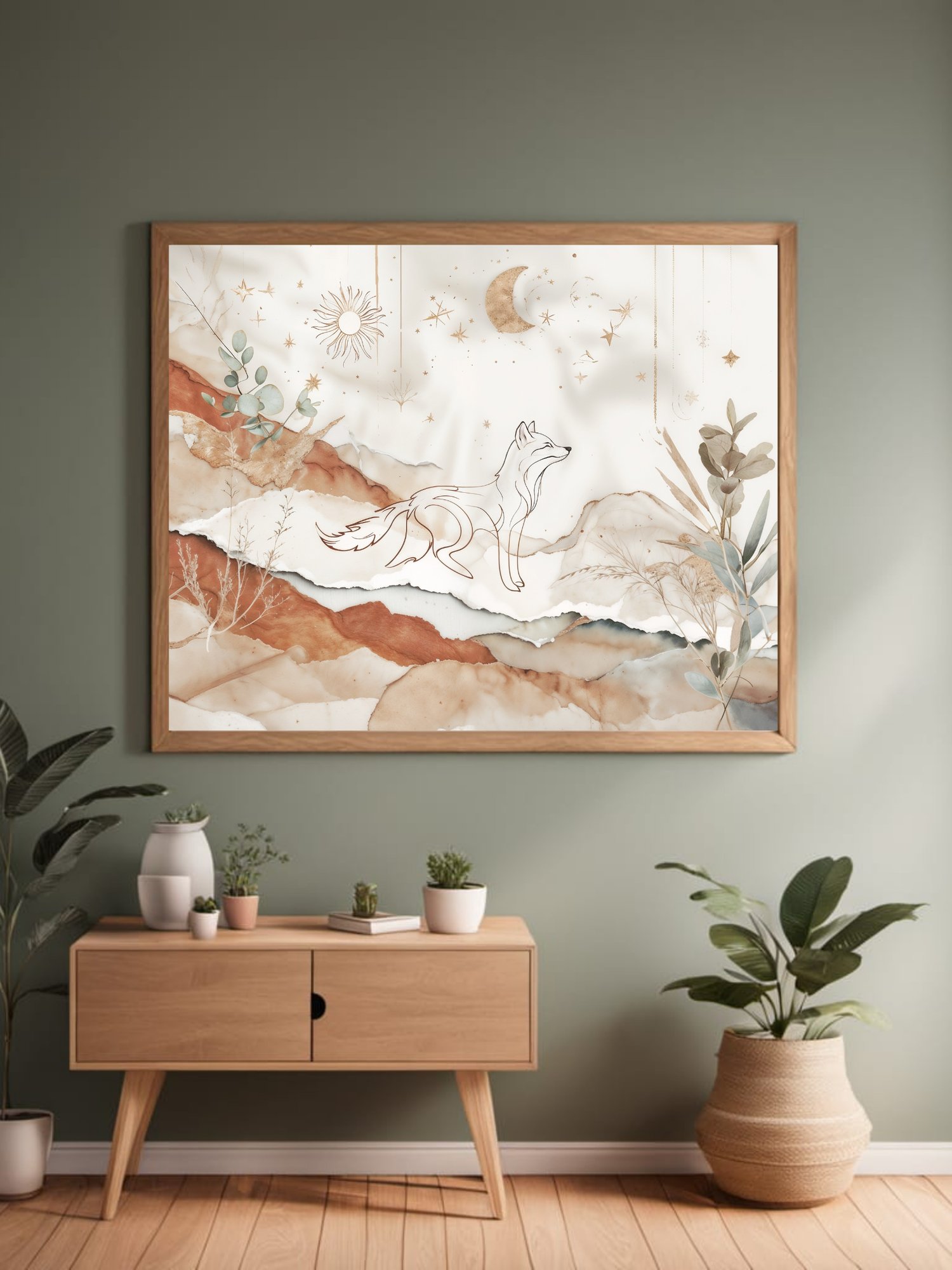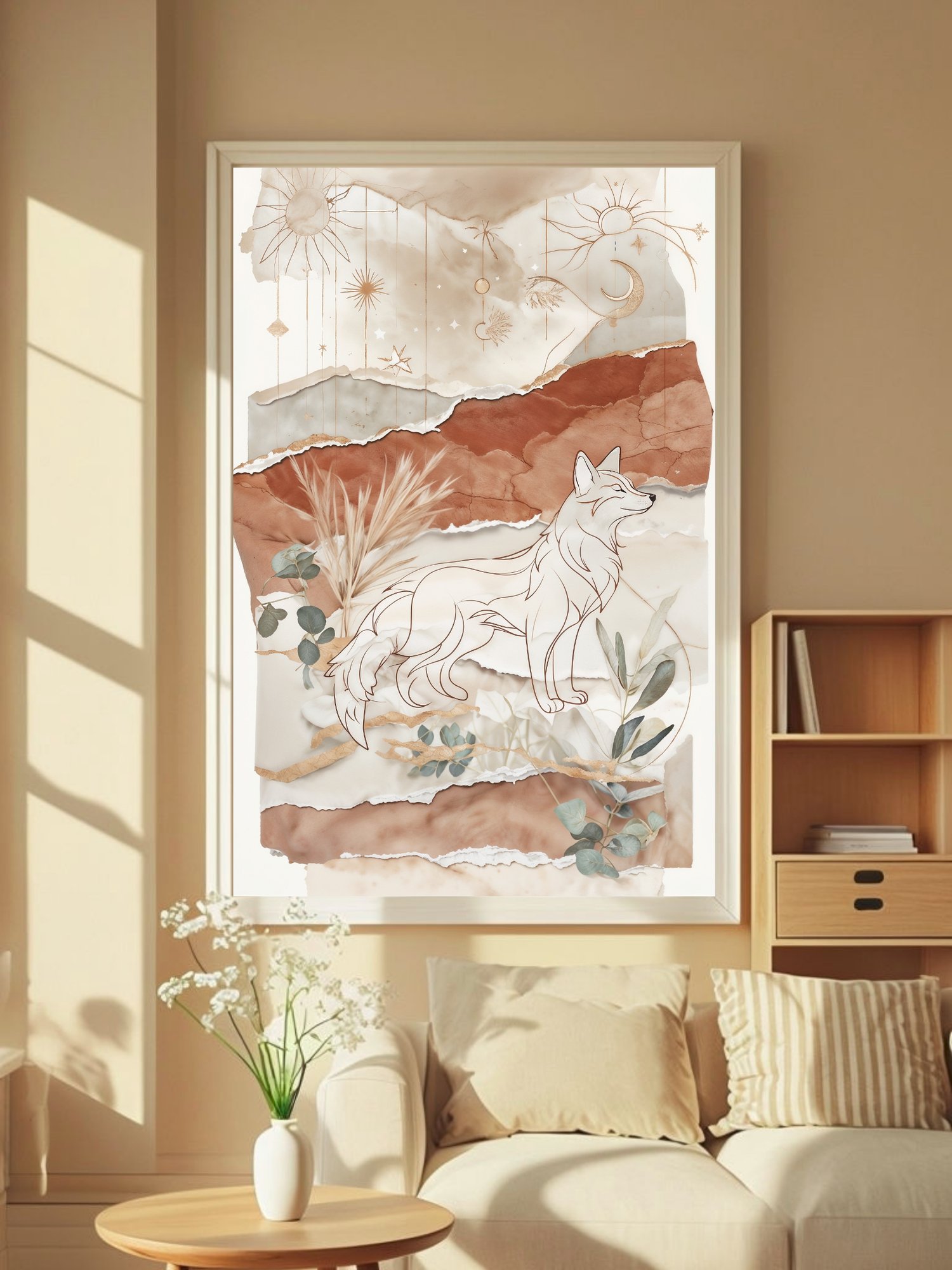 Bring calm, magic, and modern style to your walls with this elegant boho fox print, a seamless blend of minimalist line art and organic textures.