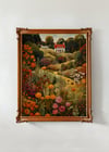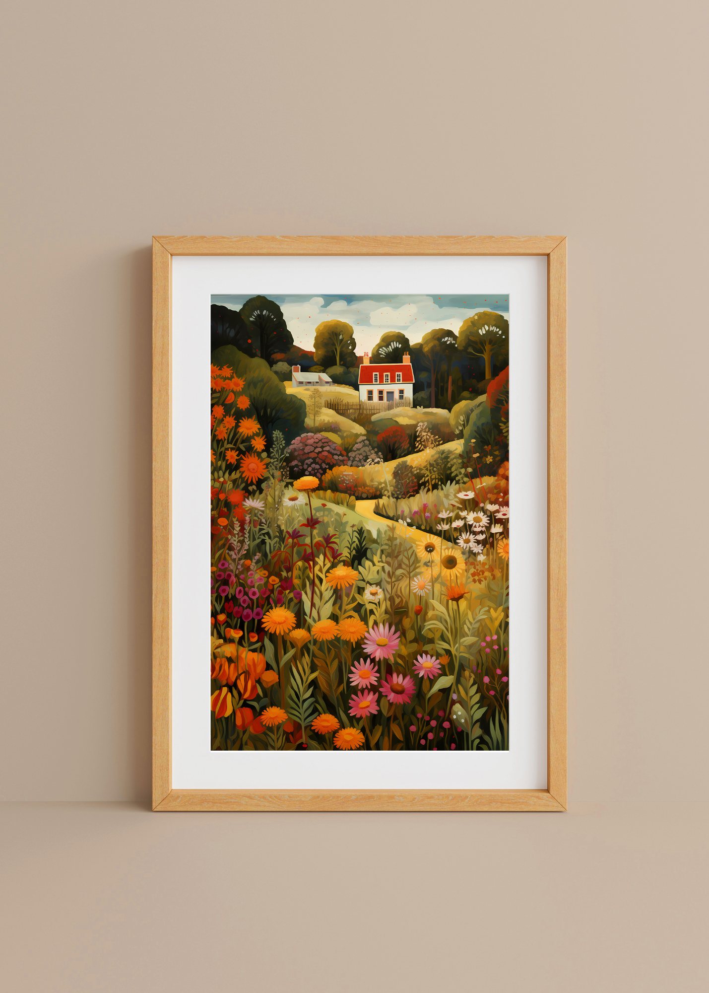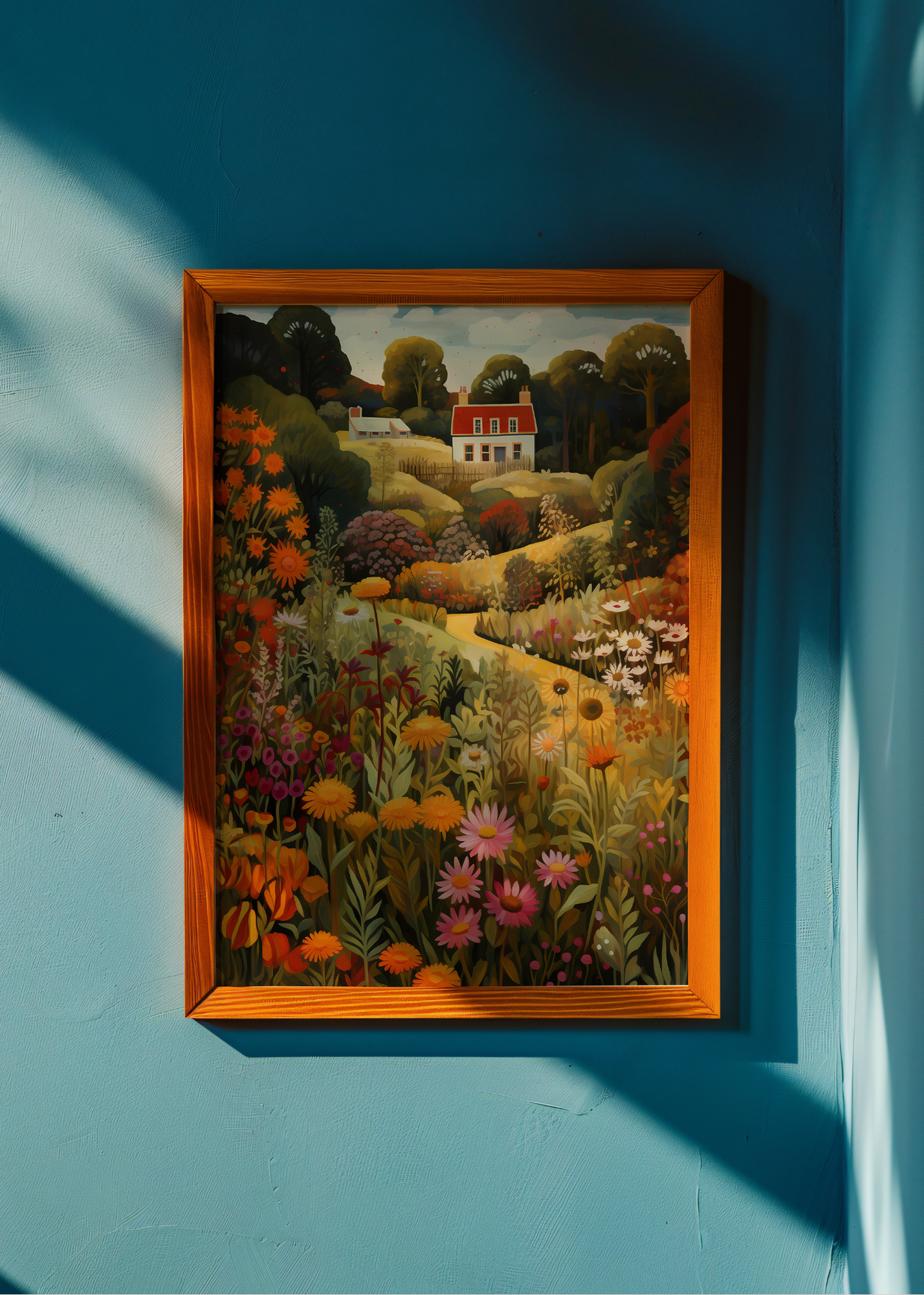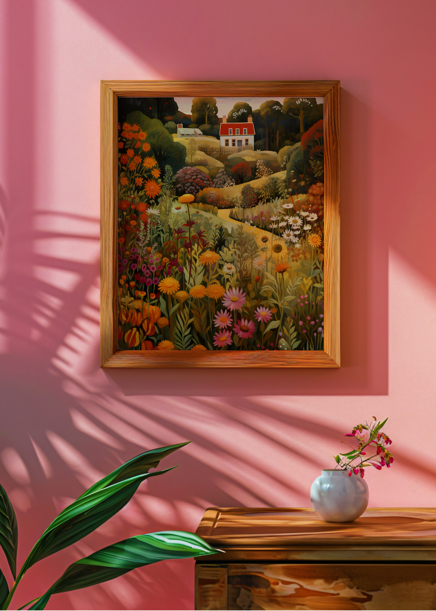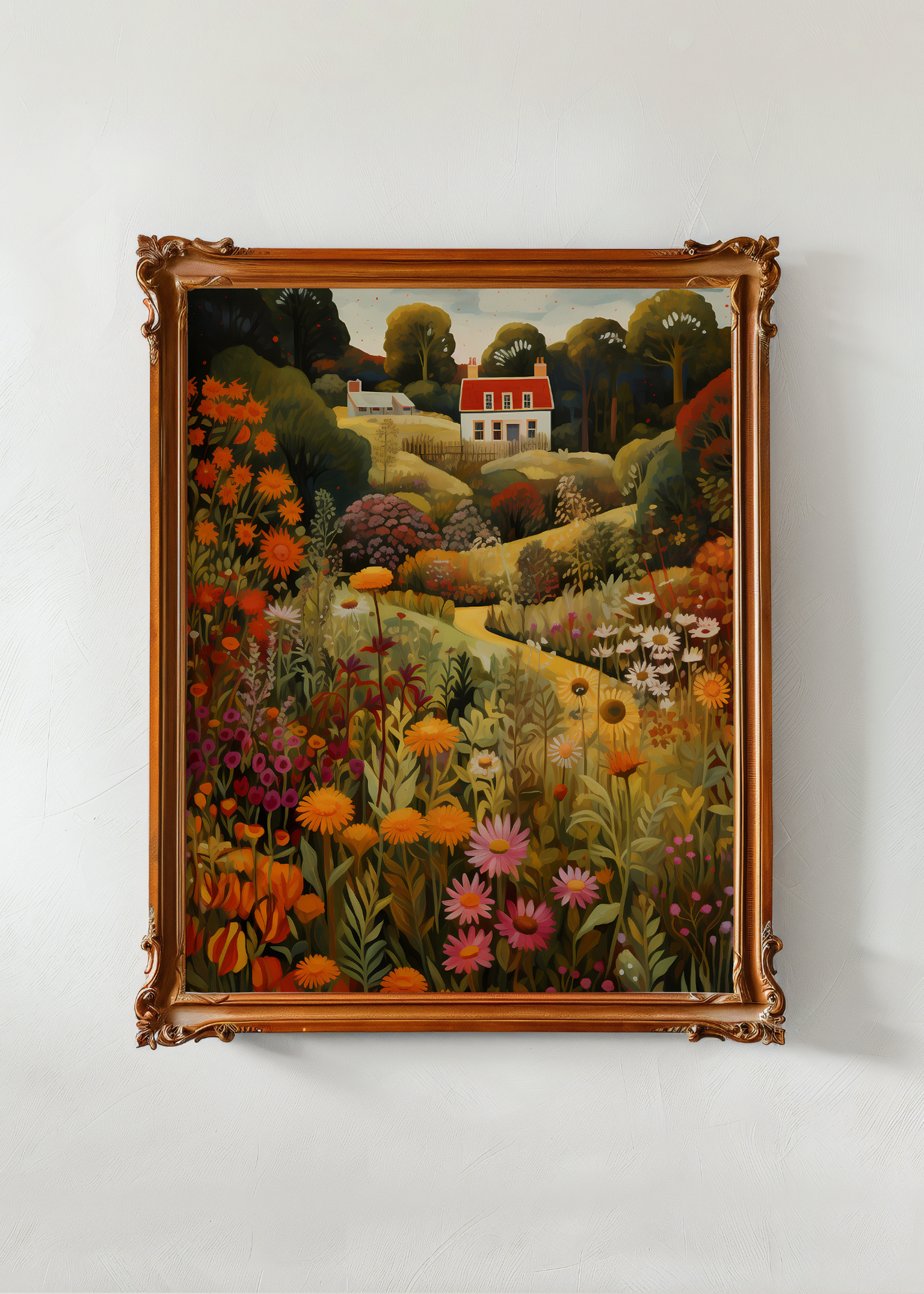 Wildflower Way— A charming countryside path winds its way through a lush meadow of golden yellows, rich tangerines, and cheerful pinks, all blooming wild in carefree abundance. Tucked in the distance, a cozy cottage with a red roof, peeks out from behind sun-dappled hills, framed by twilight trees and garden hedges. This piece radiates a slow-living kind of magic—a celebration of warmth, nostalgia, and the quiet beauty of living close to the land.