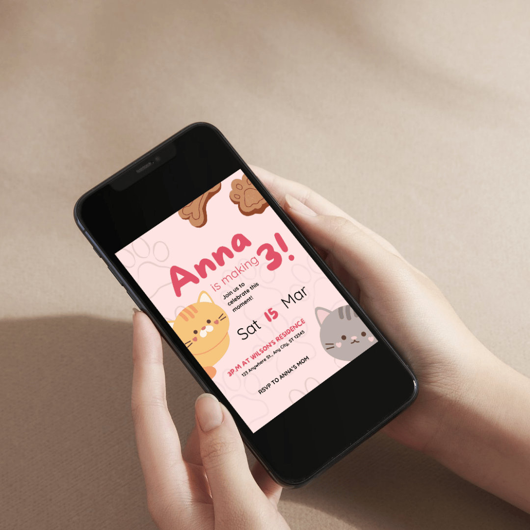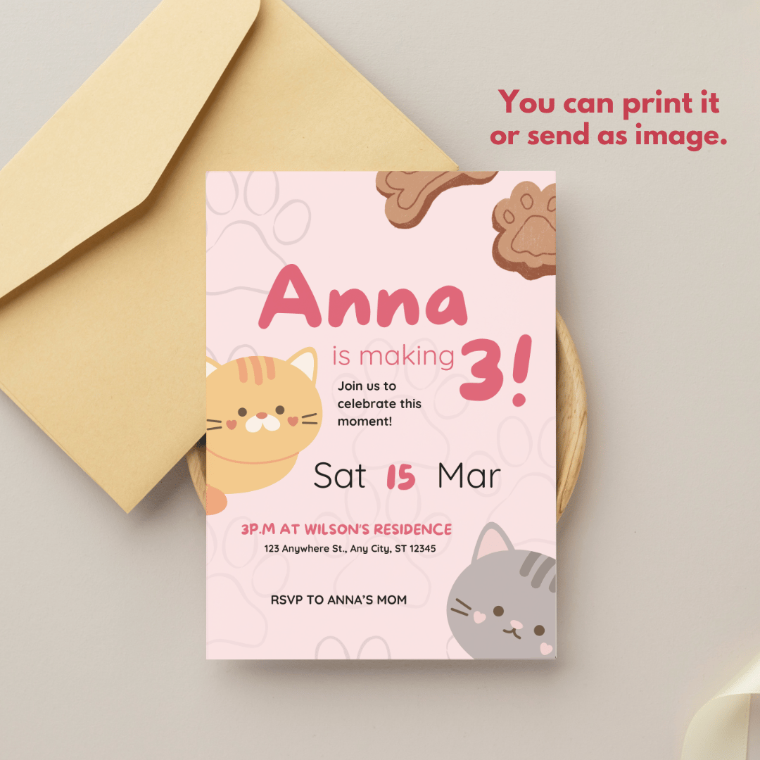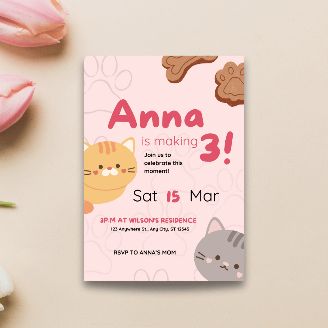 Perfect for kids' celebrations, this pink-themed template features adorable cat illustrations and paw-shaped details, making it ideal for pet lovers. Created in Canva by BluePrintFlow, this editable and printable digital template is super easy to customize with your details.