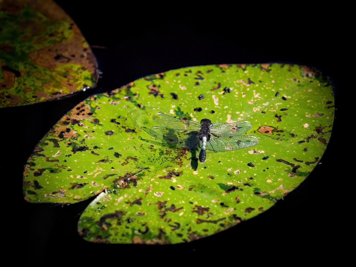 Eastern White-faced Darter (Leucorrhinia caudalis) sits on a plant and waits for a suitable prey.