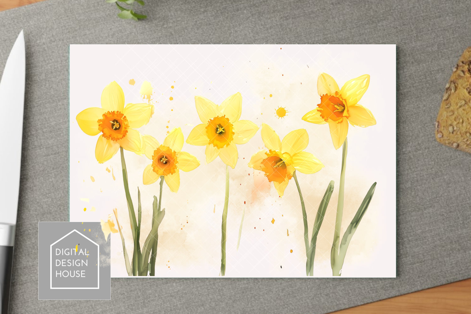 Welcome to this listing for a beautiful watercolour illustration of a set of Daffodils with watercolour splashes. Perfect for Sublimation and Print. You get 4 x PNGs, a square, rectangle, round and mug wrap making it great for everything from chopping boards to lap trays to cushions, cards and mugs. Thanks as always for looking,