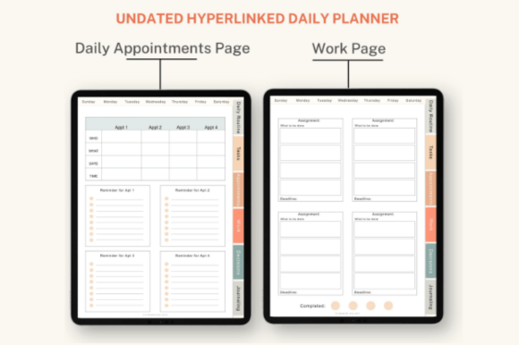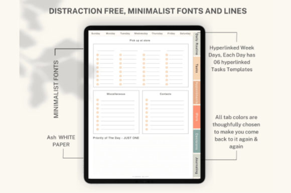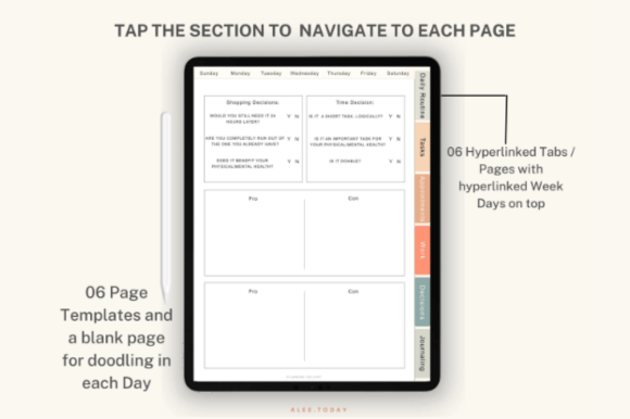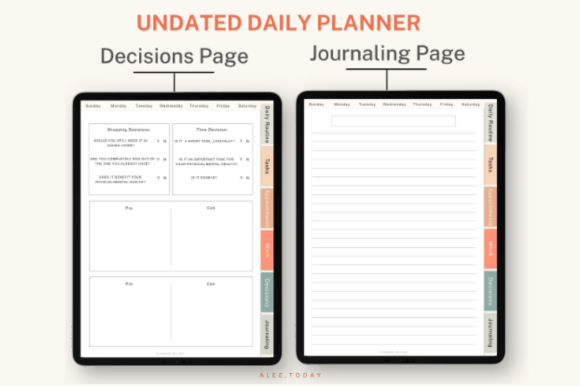 Each day includes 6 functional templates that help reduce decision fatigue and maintain focus: daily routine, tasks, appointments, work section, decision-making page, and a journaling page.