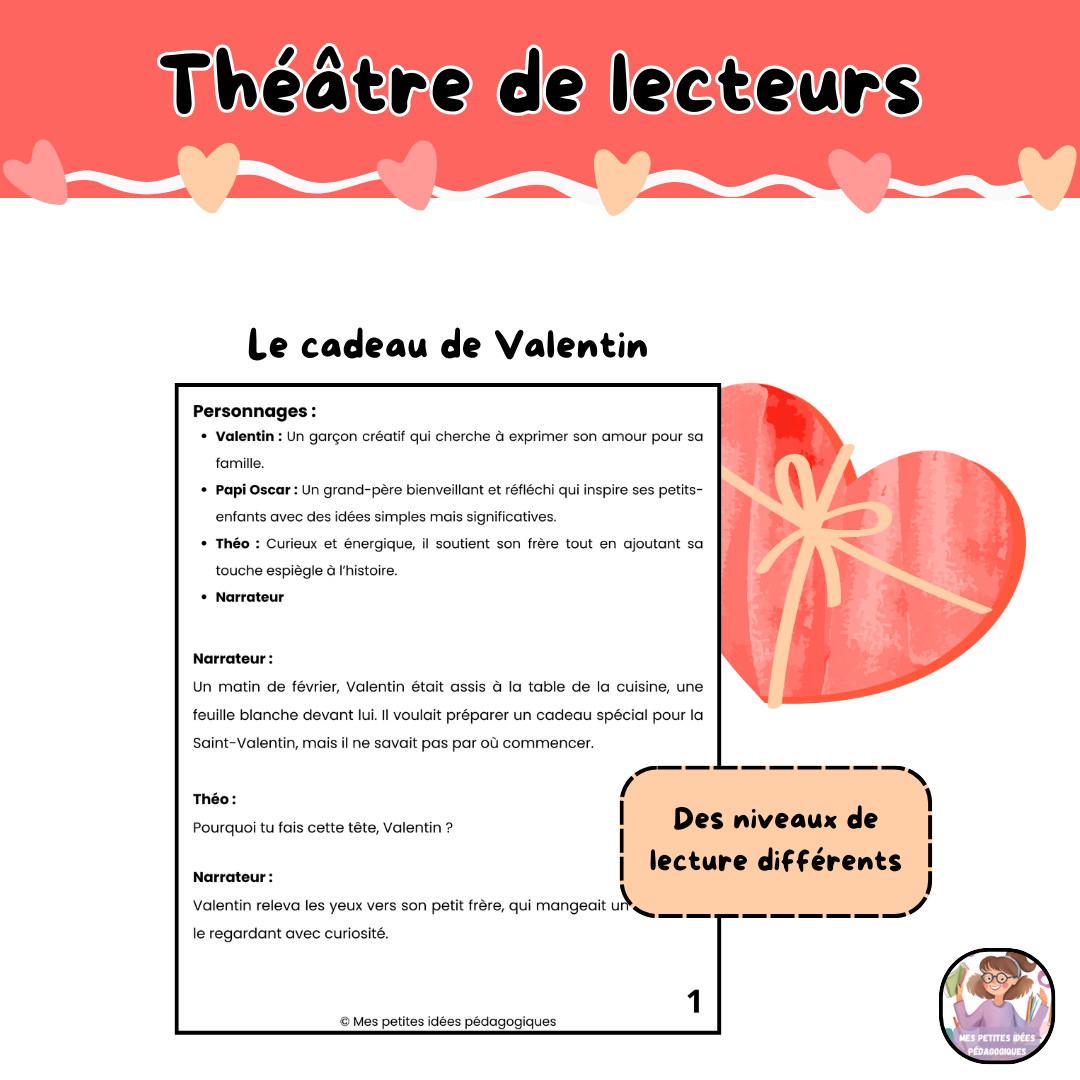 Ce théâtre de lecteurs permet aux élèves de 2e année de participer activement à la lecture, en alternant les rôles entre les personnages. C’est un contexte concret et ludique pour travailler la fluidité en lecture. Le document peut être utilisé avec des élèves de niveaux scolaires variés selon leur habileté en lecture et en fonction de l’intention pédagogique recherchée. Ce matériel peut donc être utilisé dans divers contextes (classe, orthopédagogie). Vous trouverez une histoire sous le thème de la Saint-Valentin et comprenant trois personnages ainsi qu’un narrateur.