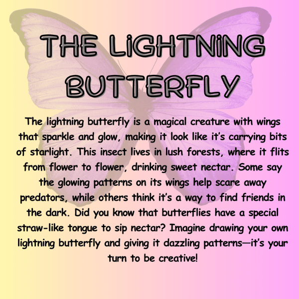Nora, a tiny butterfly living in a garden full of colorful flowers, dreams of becoming a special butterfly that lights up the night like the stars. But Nora is afraid of flying in the dark. With the help of her friends—a wise silkworm and some cheerful bees—Nora learns that courage and believing in yourself are the keys to making dreams come true. On a magical night, Nora discovers that her wings have a special glow, lighting up the entire garden and becoming the "Lightning Butterfly" who inspires everyone around her.