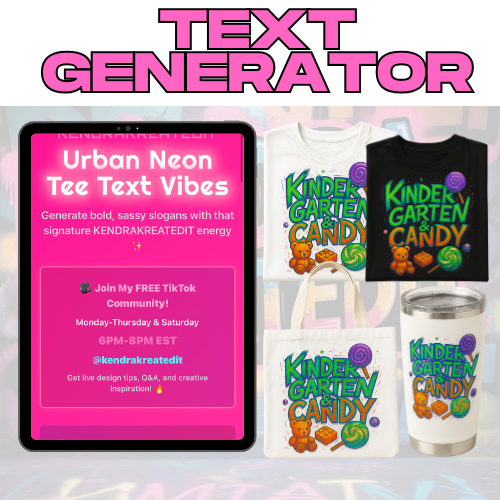 Turn your words into bold, vibrant, ready-to-print T-shirt slogans with this fun and easy Canva AI generator! Designed in my Kendra Created It style, this tool creates urban, sassy, and eye-catching text-only tee designs that look like something you’d actually say out loud.