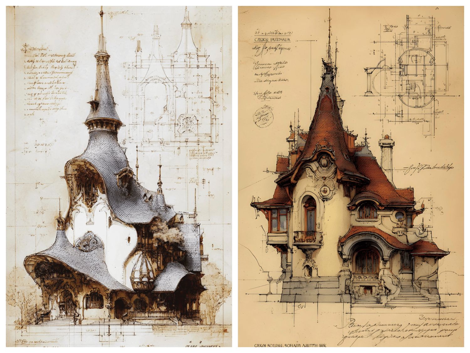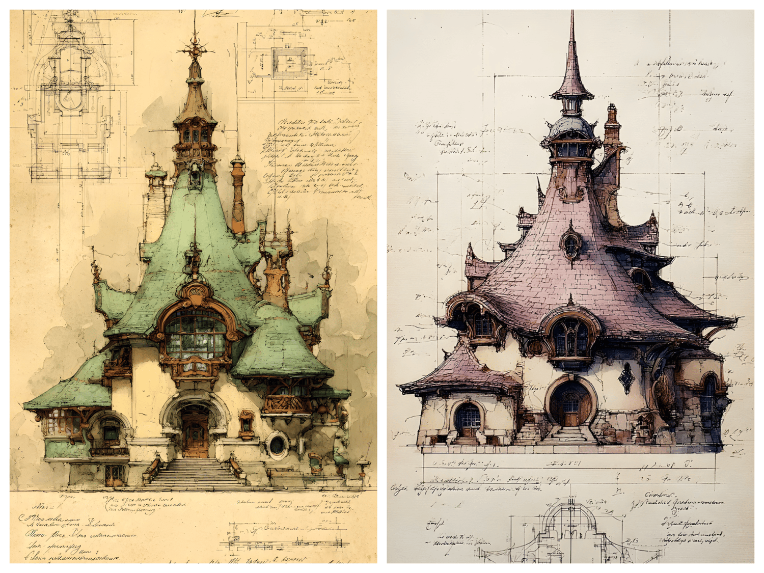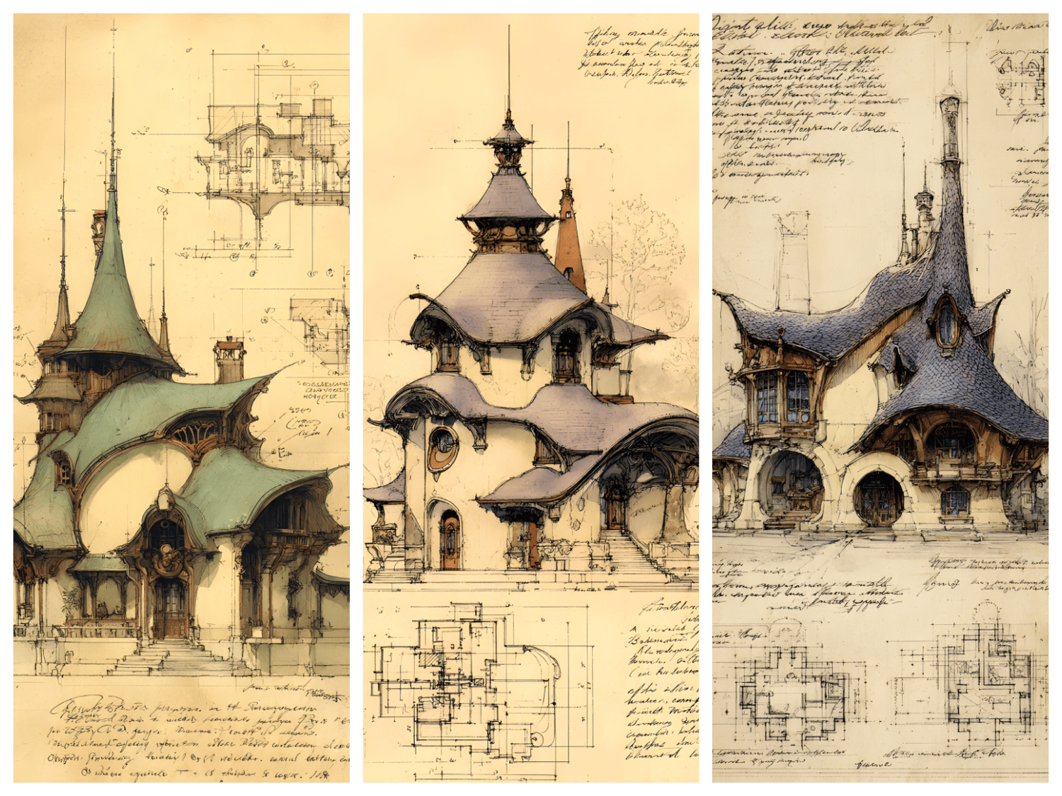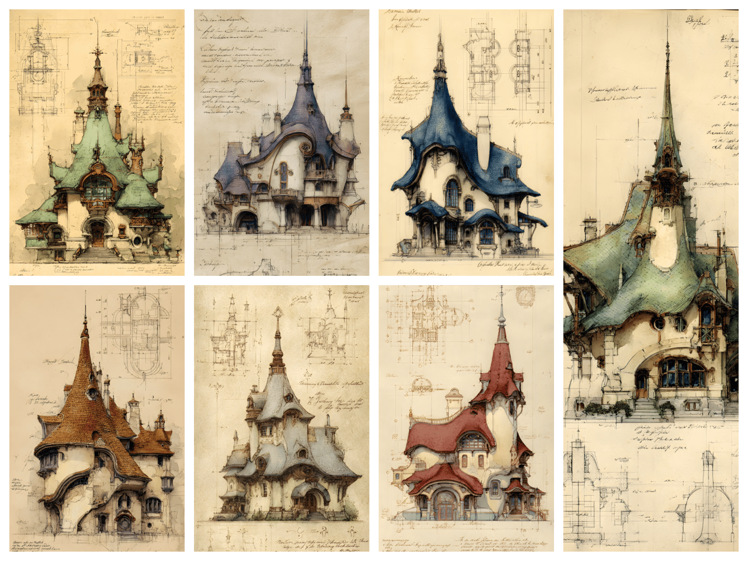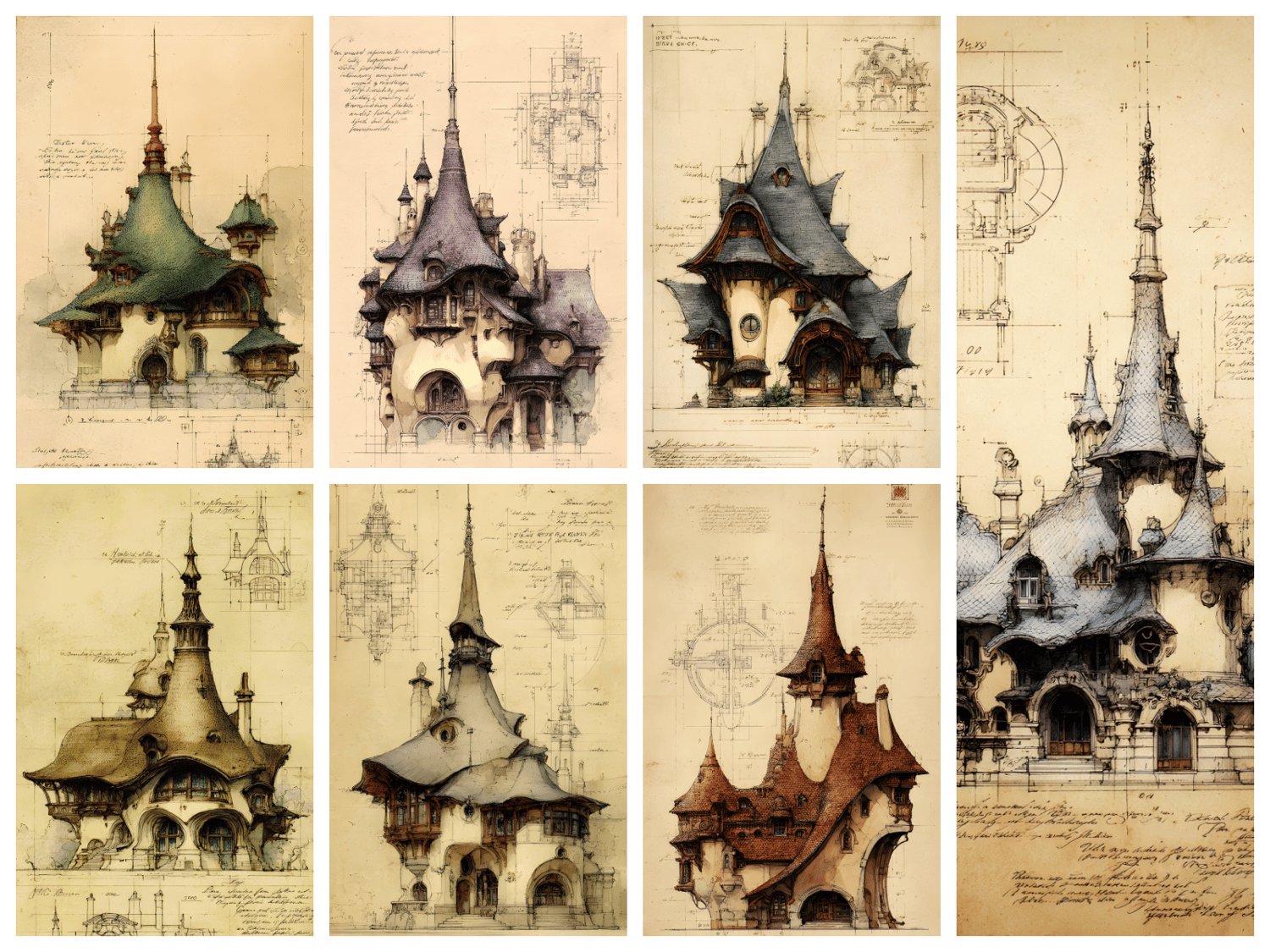 120 AI-generated digital art prints – fantasy architecture collection featuring green, purple, blue, sepia, gray and burgundy colorways. High resolution 300 DPI, 9x16 format, 2700x4800 pixels. Instant download. No physical product. Commercial license included.