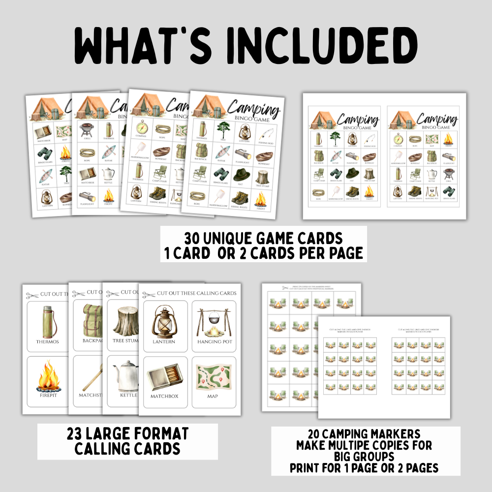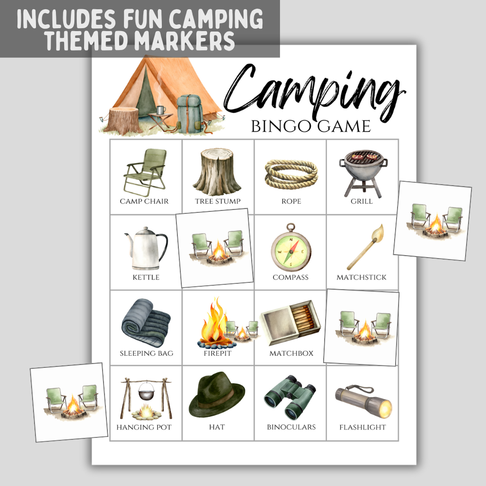 Bring fun and excitement to your outdoor adventures with our Camping Bingo Game Printable! This delightful set includes 30 unique game cards, calling cards, and bingo markers designed specifically for camping enthusiasts. Perfect for family gatherings around the campfire or keeping kids entertained on a hiking trip, this printable game offers endless hours of interactive fun that can be enjoyed by campers of all ages.