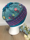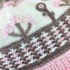 This hat in three sizes begins with your choice of three different brims, continues with horizontal braid and then a lattice in three colors. Don't let that worry you though. It's an illusion. Each row is knit with just one color and slipped stitches are used to give it the illusion of colorwork. The stems of the flowers are done with your choice of duplicate stitch or an anchored crochet chain. Top the stems with buttons or embroider lazy-daisy flowers. And why use a pompom when you can have a hat on the top. Although a bit fiddly, the flower is knit in one piece and tacked to the top of the hat. This is certainly not your run-of-the-mill hat.