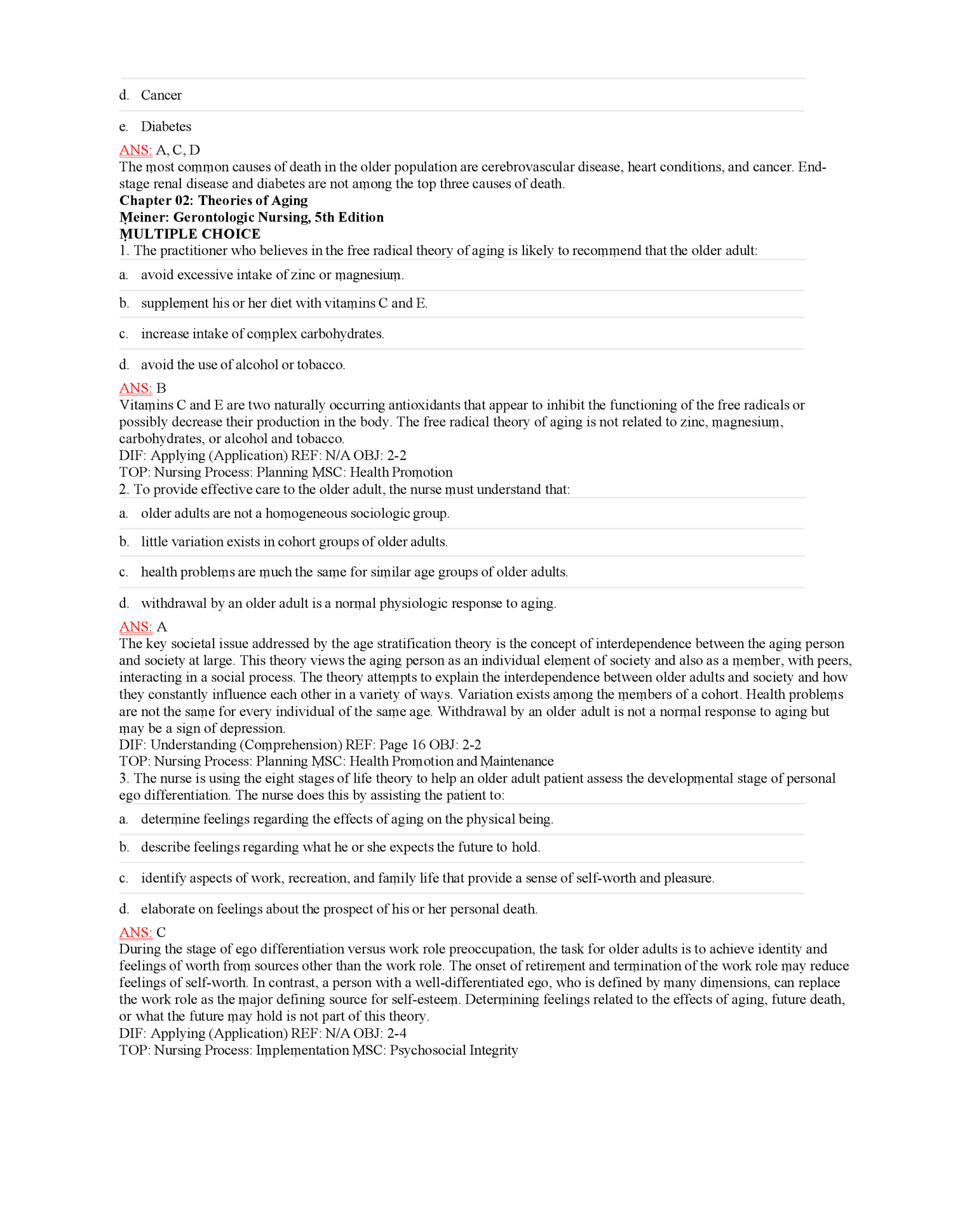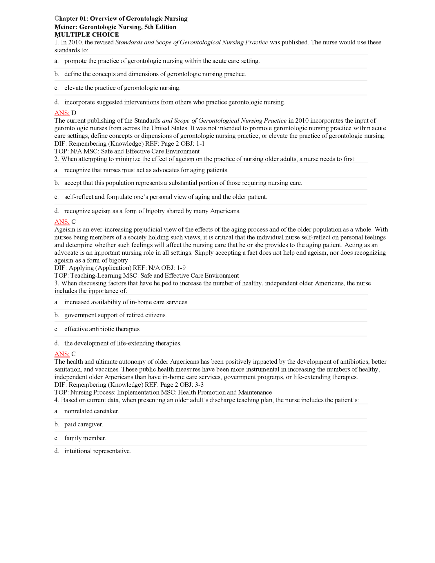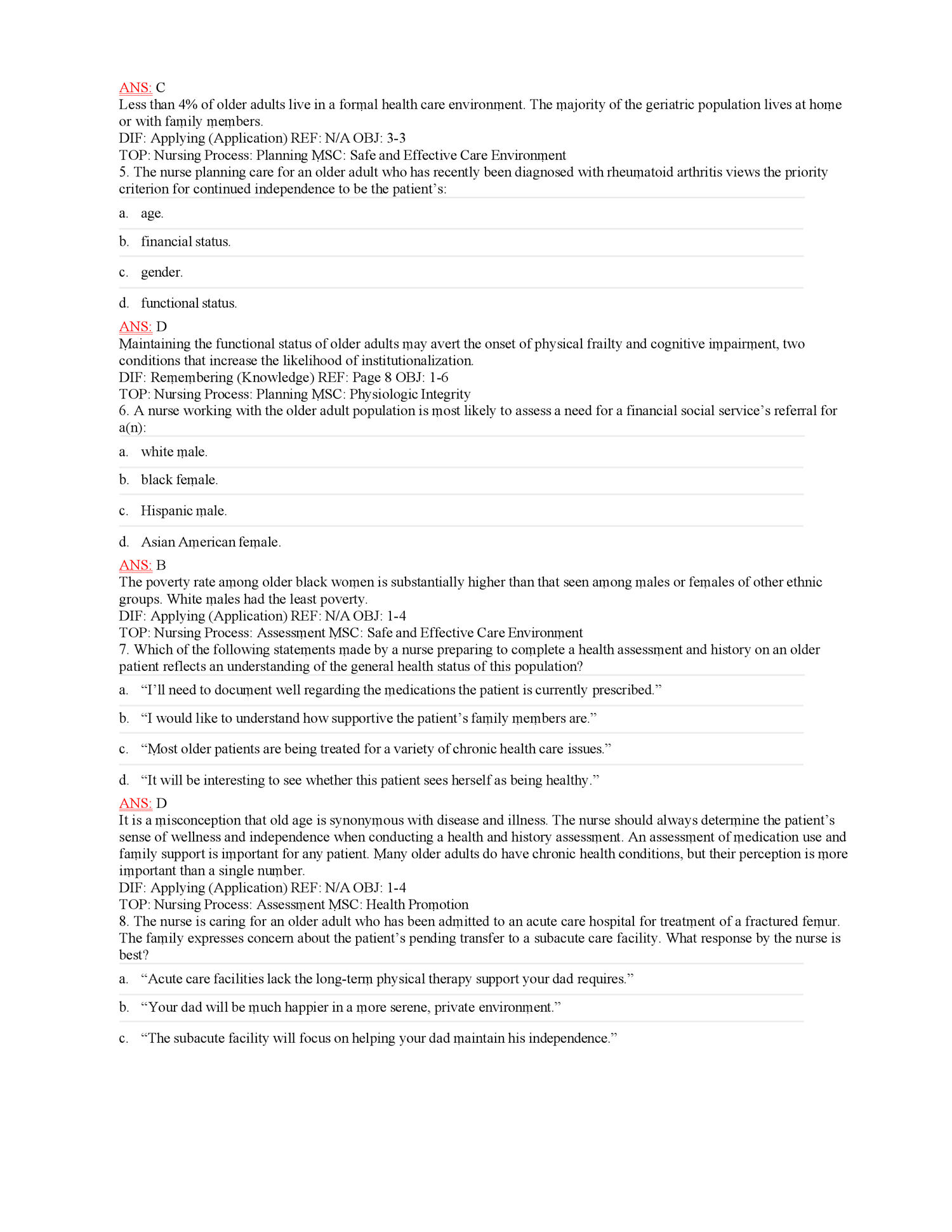 Perfect for nursing students, instructors, and healthcare professionals, this test bank reinforces critical concepts such as aging theories, chronic illness management, long-term care, and evidence-based nursing practice.