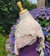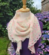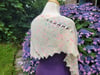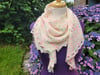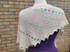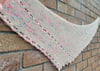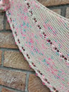 A simple shawl with a cross stitch and bead design, complemented by a three bead detail on the cast-off edging. A perfect one skein shawl.