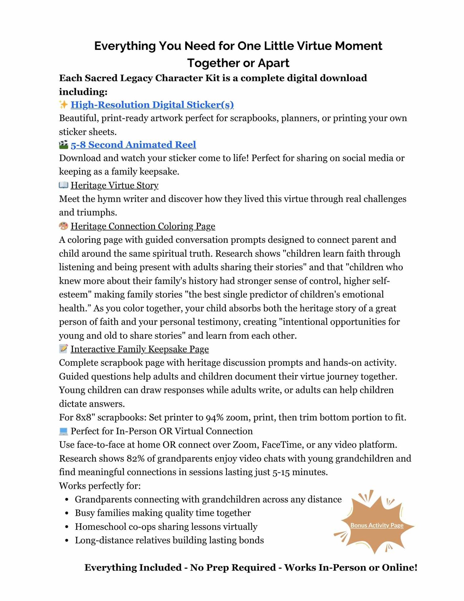 · Complete scrapbook page with guided questions for documenting your virtue journey