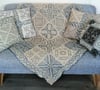 The White Star afghan/blanket features an original graphic mosaic pattern. The blanket, the Mill Star cushion cover and the Ivory Star cushion cover make a great design feature for your house. Malabrigo Yarn Rios used for the sample is a 100% merino yarn which grows when blocking. Using different fibres might affect the size of the blanket.