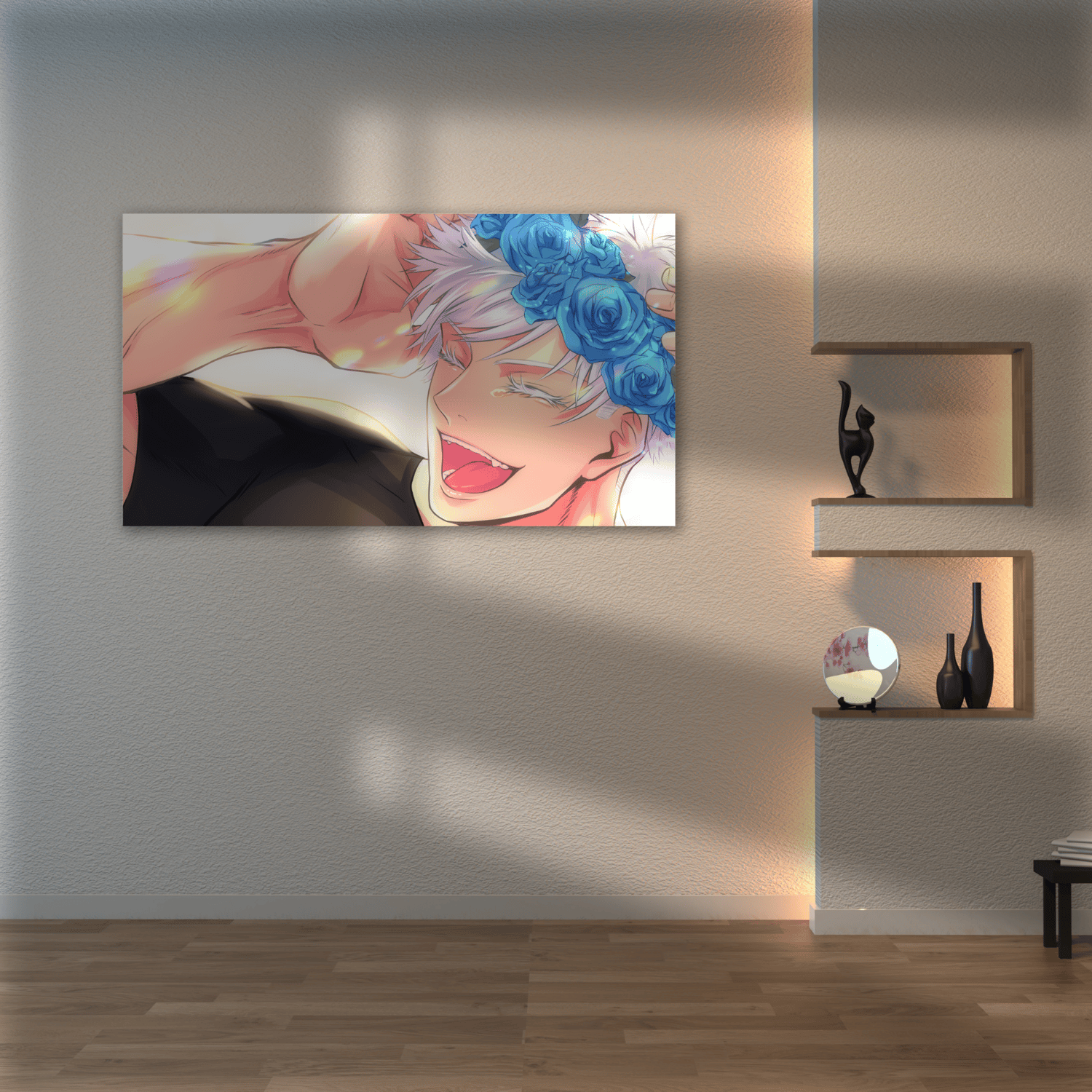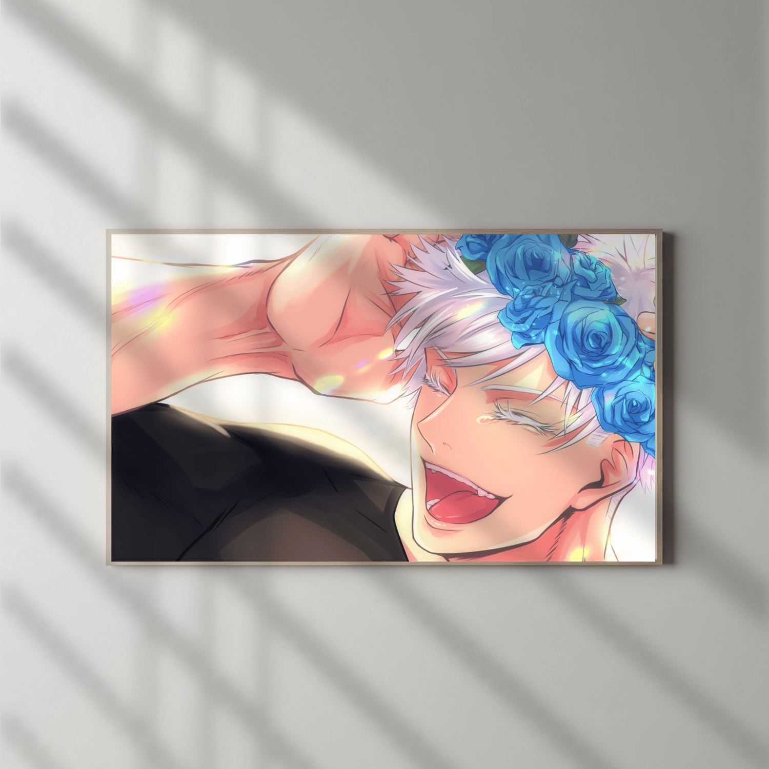 Joyful Gojo: A heartwarming, sparkling illustration of Satoru Gojo with a blue flower crown.
