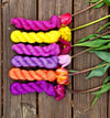 Two skeins of Marianated Yarns Scrumptious HT (80% superwash merino/10% cashmere/10% nylon, 400 yds/100 g) in The Green of Her Dreams (MC) and one Six Pack Perfection Gradient Set Scrumptious HT (six skeins, approximately 133 yds/33 g per skein) in Wicked Tulips (CC1 through CC6)
