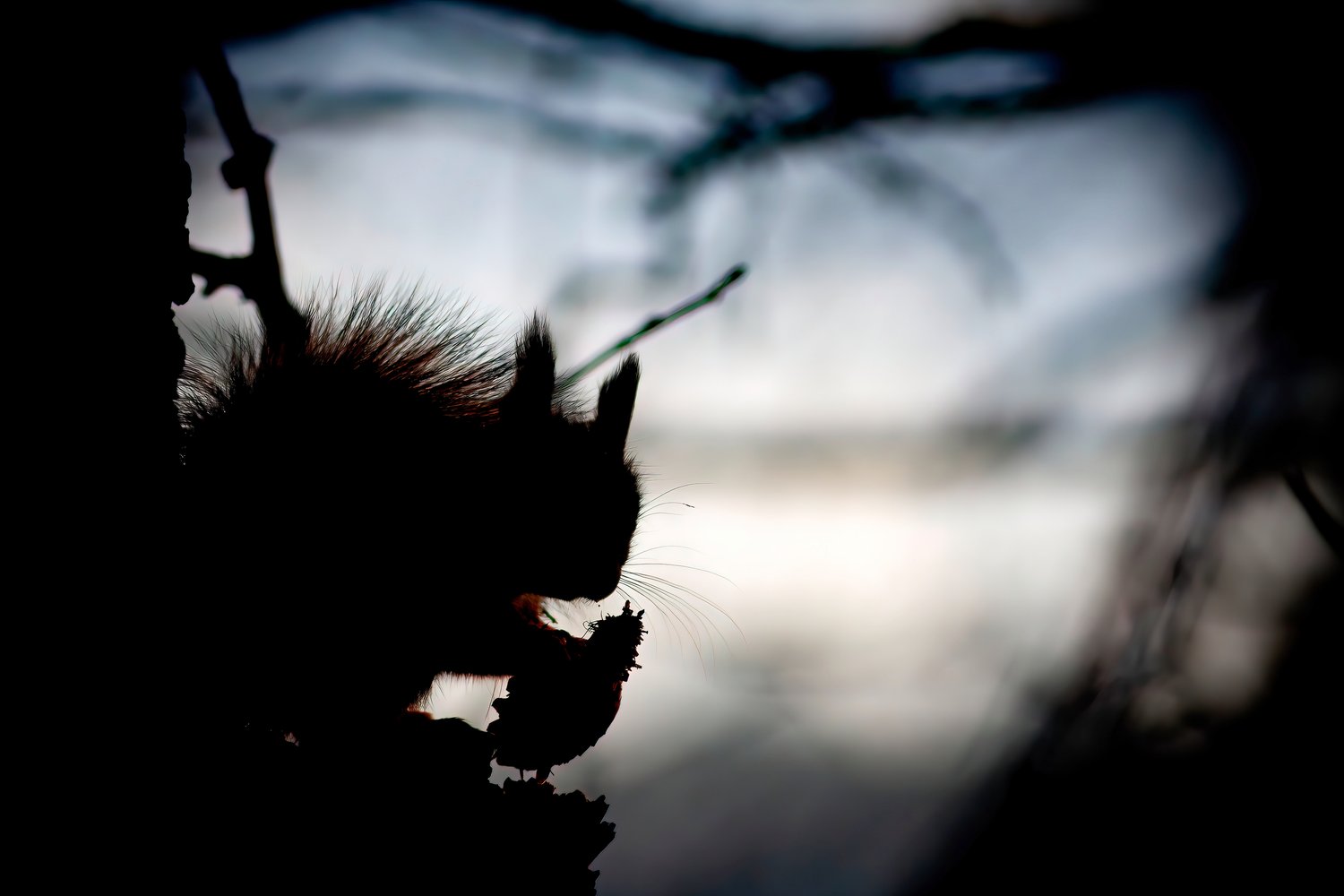 Silhouette image of a squirrel (Sciurus vulgaris) eating a fir cone.