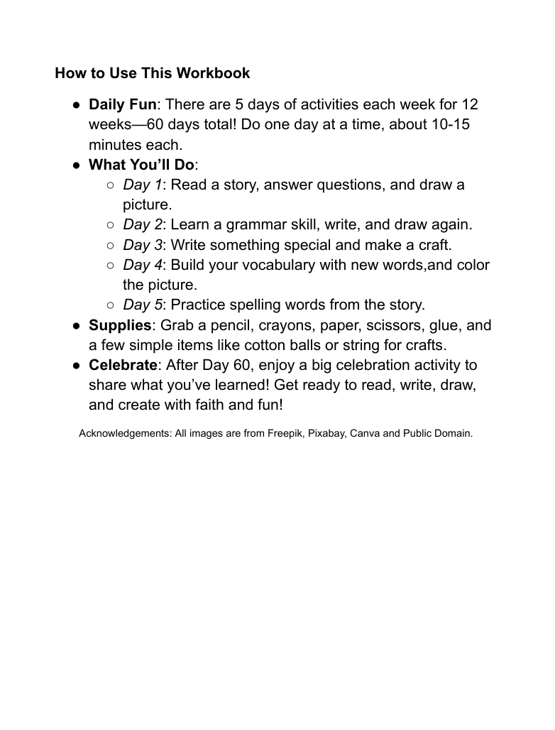 Embark on a 60-day adventure with Shining Faith! This engaging workbook weaves Bible-inspired stories with fun language arts activities for 4th graders. Through reading, writing, drawing, and crafts, children explore Christian values like love, kindness, and hope while sharpening comprehension and grammar skills. Each week’s captivating tale and creative tasks spark imagination and deepen faith, culminating in a joyful celebration. Perfect for young learners eager to grow in words and wisdom!