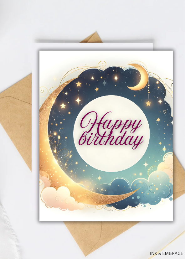 Wish them a truly magical birthday with this enchanting Celestial Happy Birthday Card from Ink & Embrace! This stunning printable PDF card features a dreamy night sky design, complete with a radiant golden crescent moon, twinkling stars, soft clouds, and subtle magical sparkles. The elegant 'Happy Birthday' message takes center stage, making it perfect for a truly special celebration.