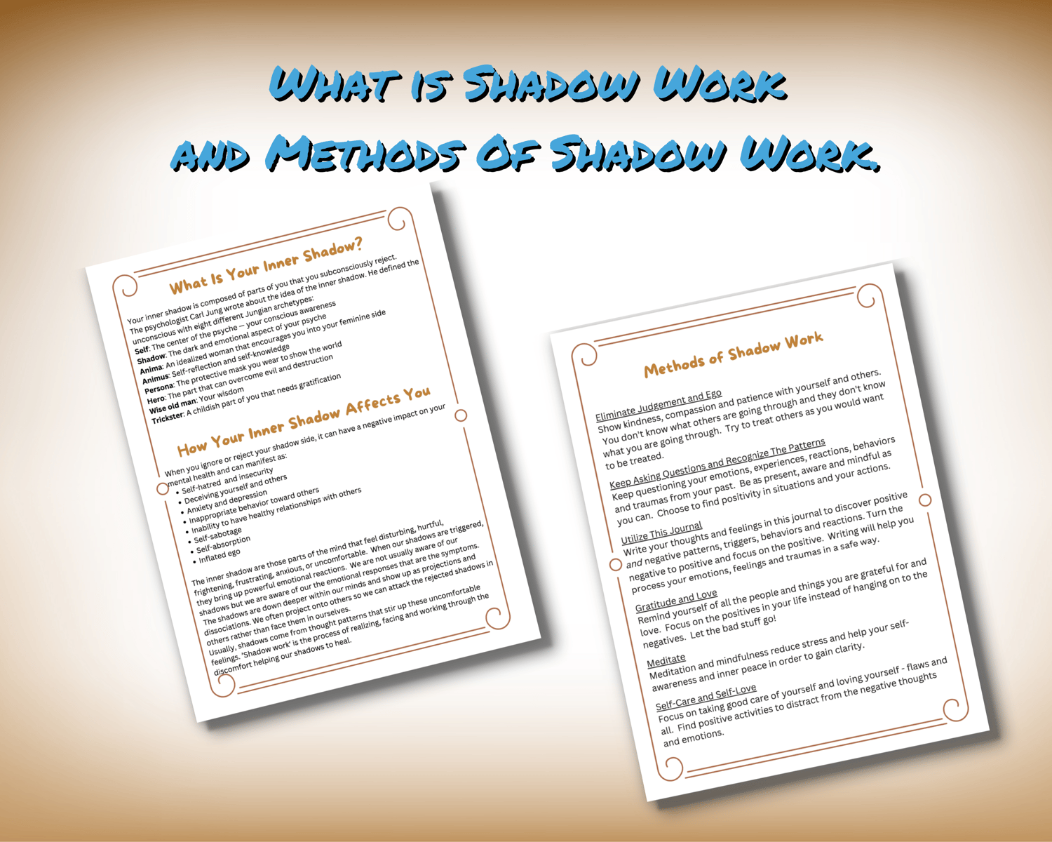 Your inner shadow is composed of parts of you that you subconsciously reject. When you ignore or reject your inner shadow, it can have a negative impact on your mental health and can manifest as negative emotions and actions. The inner shadow are those parts of the mind that feel disturbing, hurtful, frightening, frustrating, anxious, and uncomfortable. When our shadows are triggered, they bring up powerful emotional reactions. We are not usually aware of our shadows but we are conscience of our emotional responses that are the symptoms. The shadows are down deeper within our minds and show up as projections and dissociations. We often project onto others so we can attack the rejected shadows in others rather than deal with them in ourselves. Shadows come from thought patterns that stir up these uncomfortable feelings. The process of realizing, facing and working through the discomfort is called “shadow work”.Guided prompts for self-reflection include: