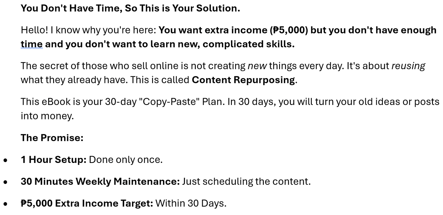 Get the ₱5K Extra Income in 30 Days Plan—the 1-Hour Setup that turns old posts into new cash using only free tools.