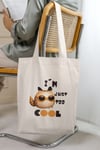 Natural color tote bag with cool cartoon cat design and text "I'm Just Too Cool", will take your shopping style to the next level!