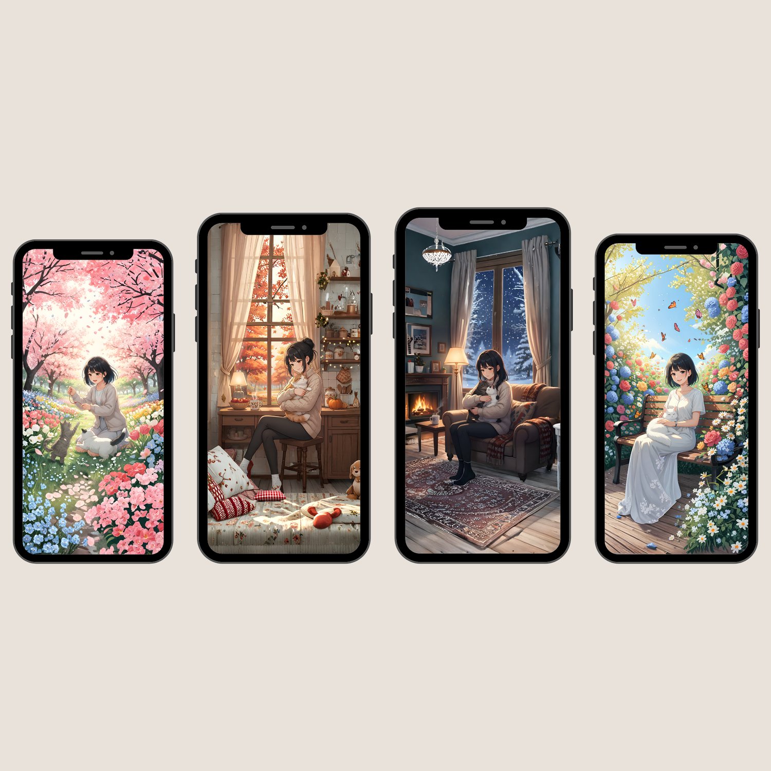 - Anime woman, different seasonal vibes, always cozy with her adorable cats 🐱