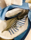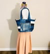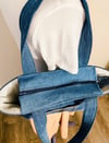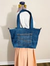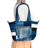 Handmade from denim jeans. Multi-wash colorblock design. Features chino pants lining, 2 outside pockets, and 3 interior pockets. There are two D rings on the outside edges for adding a crossbody strap or key rings.