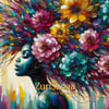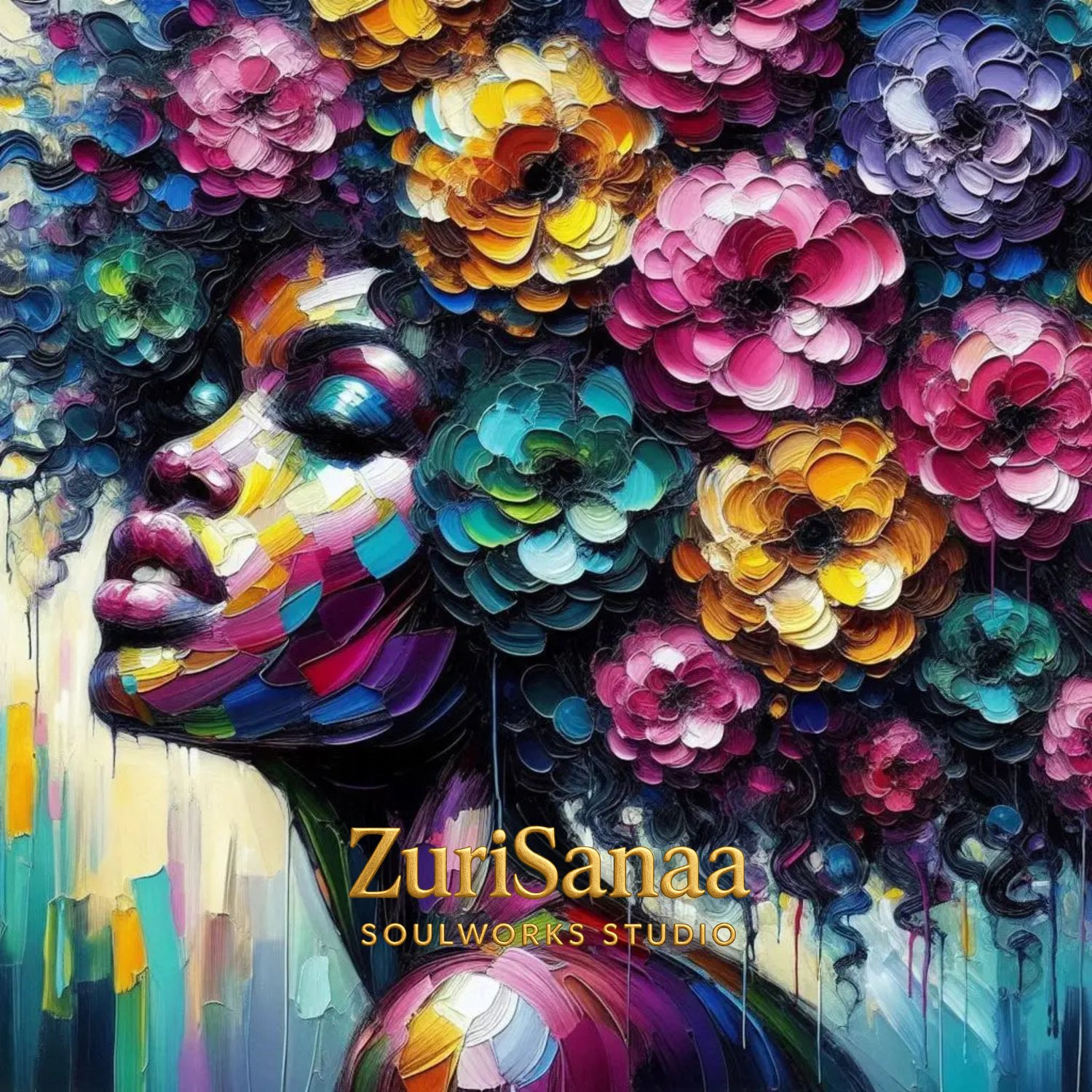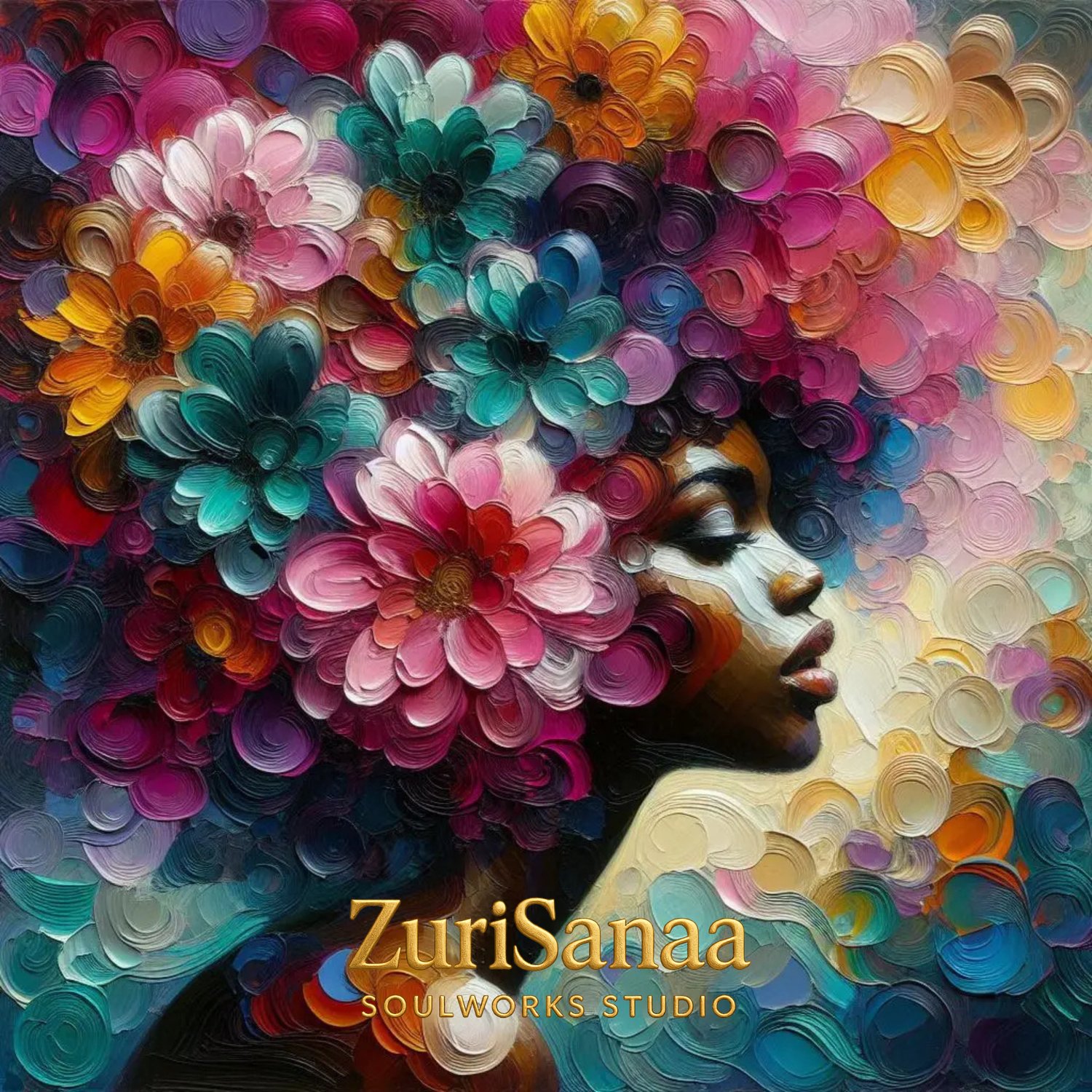 Each image blends sculptural brush strokes, mosaic-like color layering, and blooming floral forms to create portraits that feel alive—rooted in softness, strength, and self-expression. The florals are not decorative; they are symbolic. Growth. Becoming. Presence.