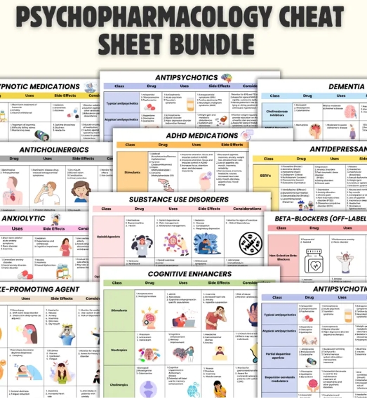 9 Comprehensive Cheat Sheets. Covering 13 Psychopharmacology Cheat Sheet Topics- All the Key Information Given In One Place.